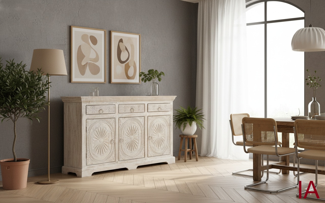 La principal característica de este aparador es la solidez de sus materiales así como un diseño diferenciador, y su peculiaridad se basa en las el tallado artesano en sus puertas y cajones, que hacen de éste mueble una pieza muy singular y plena de estética. Un ejemplo de diseño que destaca por su simplicidad, carácter y naturalidad.