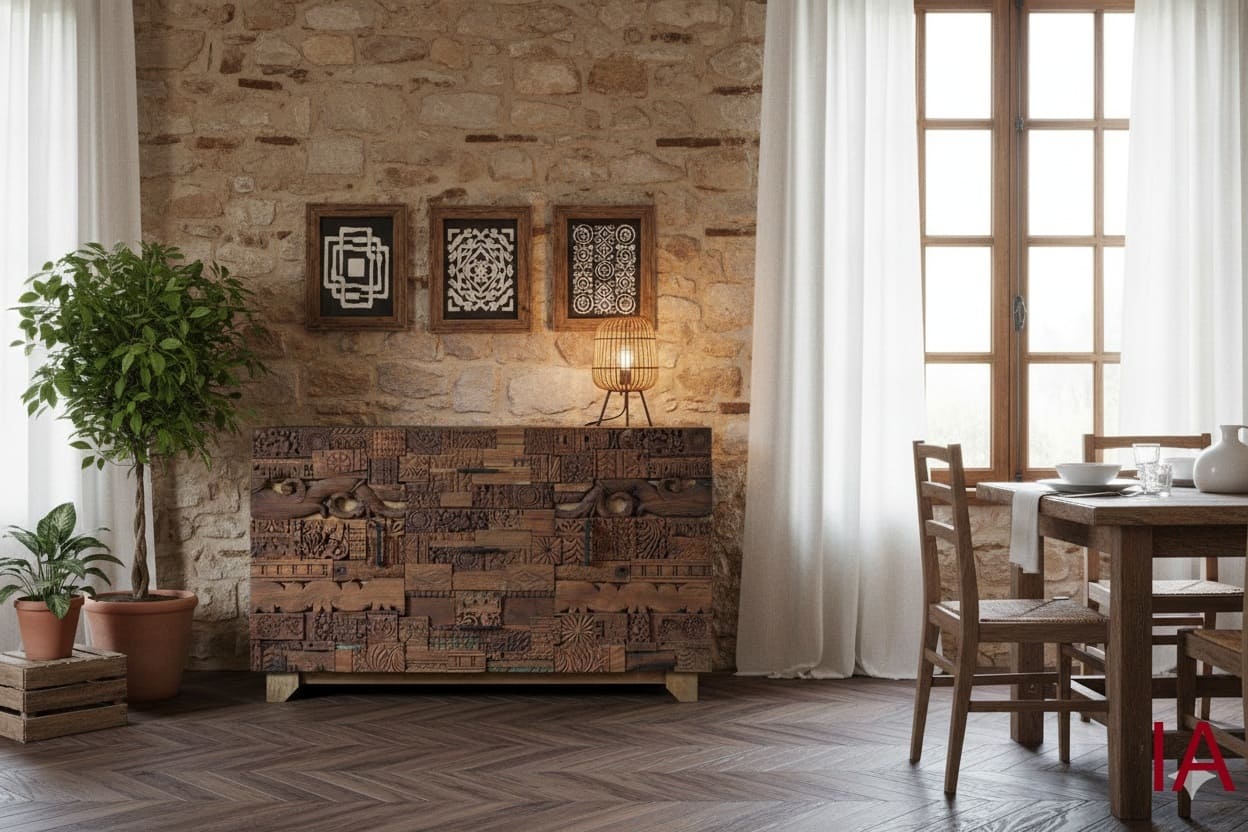 • FRENTE DE MADERAS RECUPERADAS Y TALLADAS: 🔪 ¡LA PECULIARIDAD INIGUALABLE! El frontal es un PATCHWORK 3D configurado con fragmentos de diversas maderas, con distintos TALLADOS, CALADOS Y MOLDURAS¡NINGÚN APARADOR ES IGUAL A OTRO! La irregularidad y el tono original de las maderas recuperadas le dan un alma y una autenticidad sin precio.