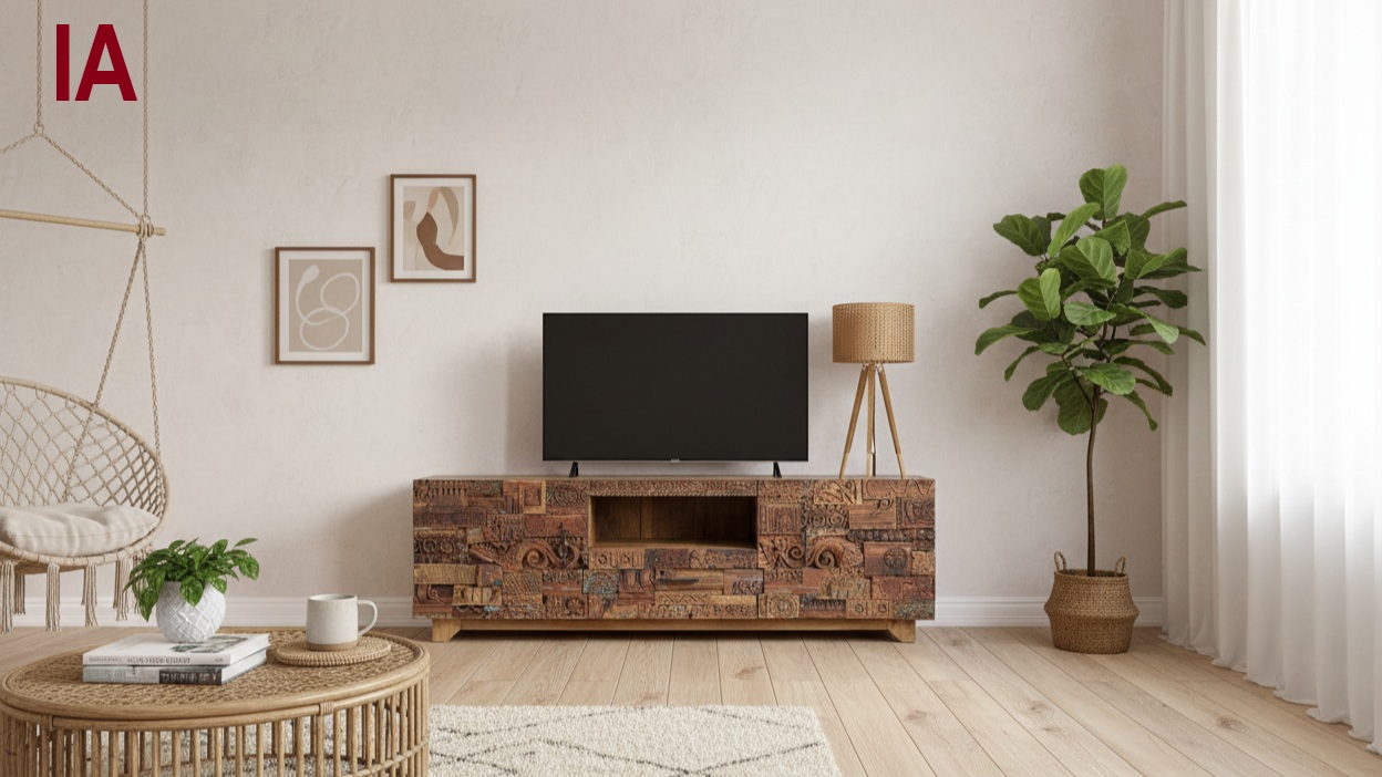 La colección Ajit está caracterizada por las diferentes piezas talladas en sus fronteras que dan a esta serie un encanto étnico y artesanal. La estructura del mueble se caracteriza por líneas limpias que contrastan armoniosamente con la naturalidad de la madera de mango. De fabricación artesanal, esta colección esta pensada para todos los que aprecian los materiales naturales y el diseño creativo. Esta colección puede ser integrada armoniosamente en muchos estilos de decoración. Con sus 2 puertas, 1 cajón y el hueco video ofrece mucho espacio para los pequeños y grandes elementos esenciales de la vida.
