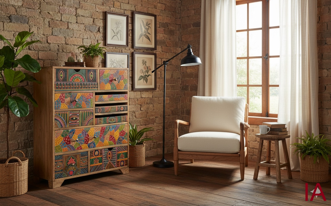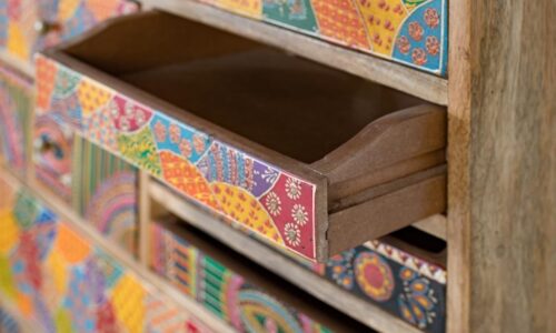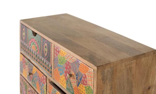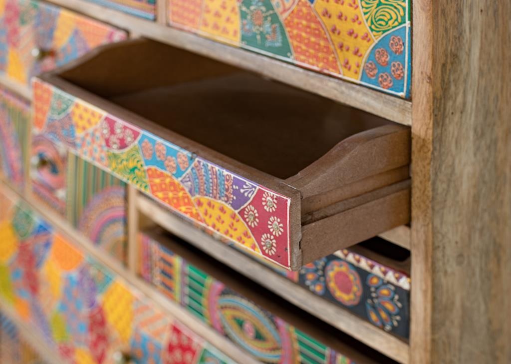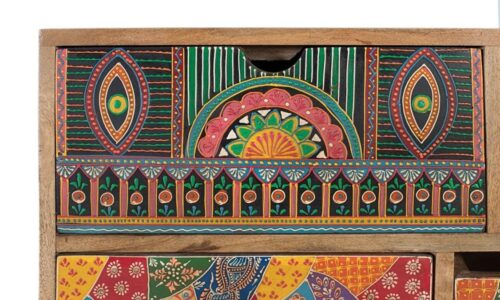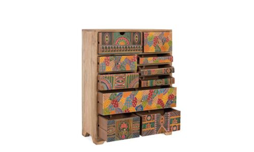 - Pura Magia Visual: Sus 10 cajones tienen frentes pintados a mano 🎨. Cada uno es único, con motivos geométricos y florales que irradian un estilo Bohemio y Artesanal inigualable. ¡Es un mueble, es arte, es una maravilla!