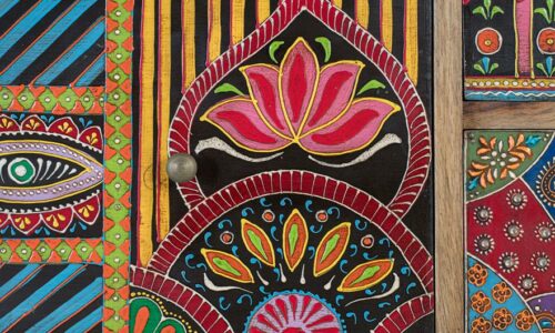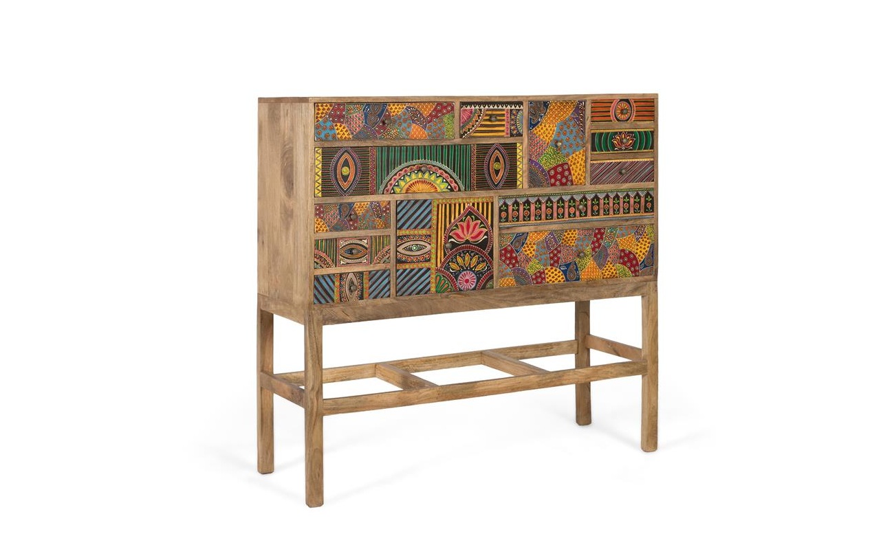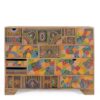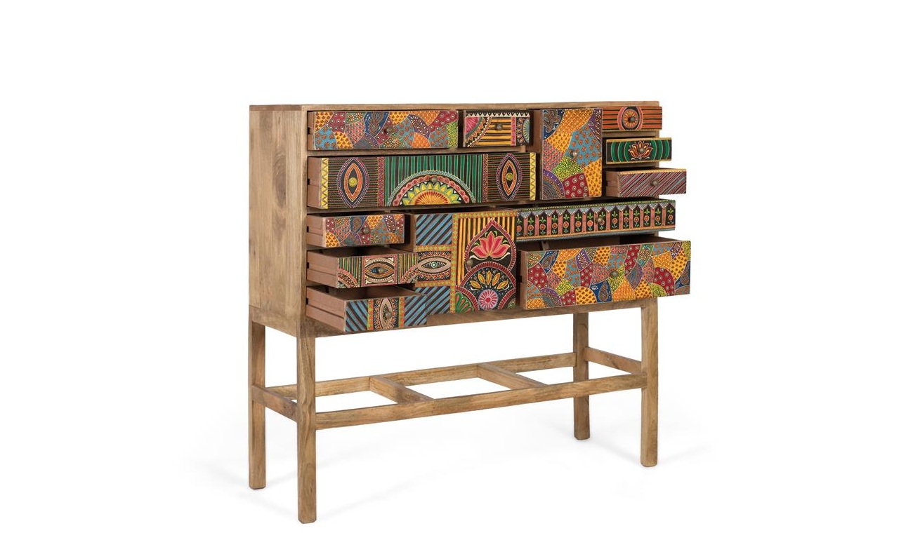 • Arte en Cada Milímetro: Su frente es un mosaico de 13 cajones de distintos tamaños 🖼️, cada uno meticulosamente pintado a mano 🎨 con motivos geométricos y florales de colores vivos. ¡Una pieza ÚNICA E IRREPETIBLE!