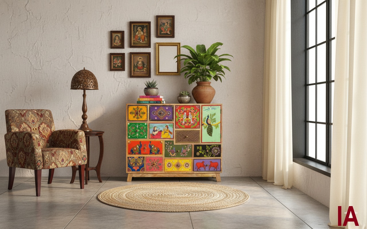 Encuentra toda la magia de la India en esta cajonera, cuya principal característica es la solidez de sus materiales así como un diseño diferenciador, y su peculiaridad se basa en el pintado a mano con motivos hindús, que hacen de éste mueble una pieza muy singular y plena de estética. Un ejemplo de diseño que destaca por su simplicidad, carácter y naturalidad.
