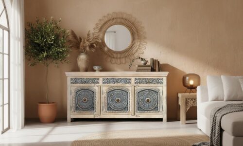 Este aparador, elaborado en resistente madera de mango, destaca por su elegante acabado en blanco lavado. Su diseño combina funcionalidad y arte. En la parte superior del mueble se encuentran tres cajones espaciosos, alineados horizontalmente, seguidos por tres puertas en la parte inferior que ofrecen amplio espacio de almacenamiento. El tallado artesanal se realza con un fondo en tono azul profundo, el cual contrasta con el blanco lavado del resto del mueble, haciendo que los relieves cobren vida y destaquen visualmente.