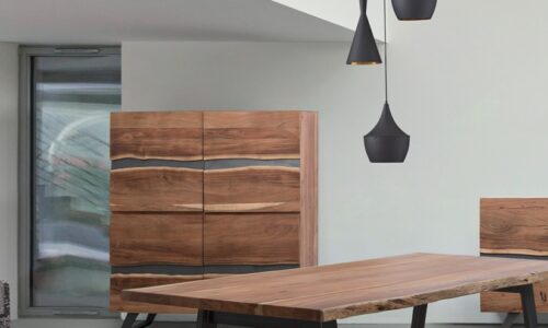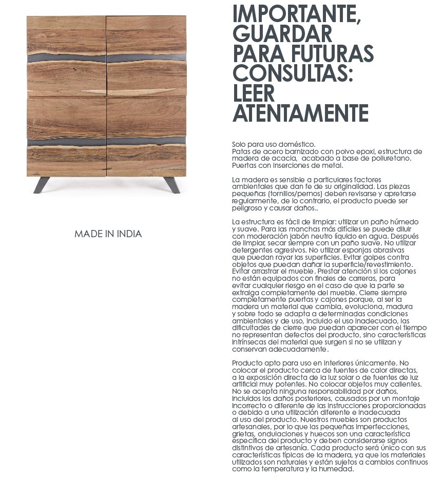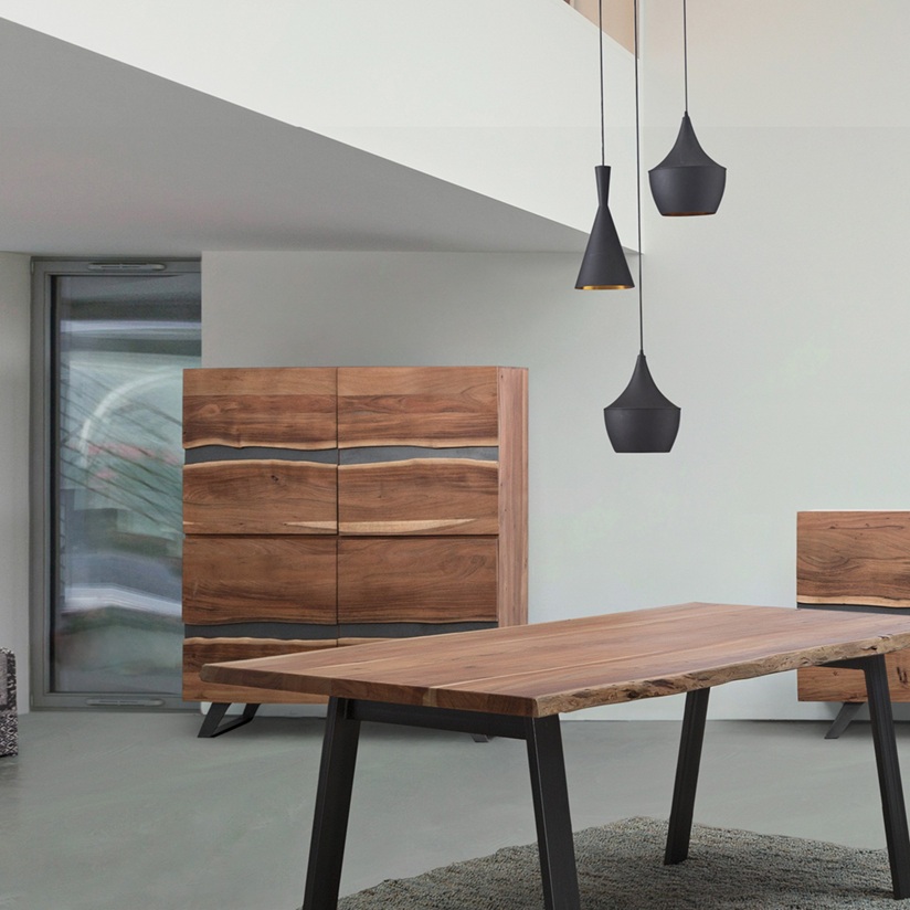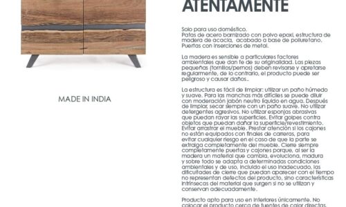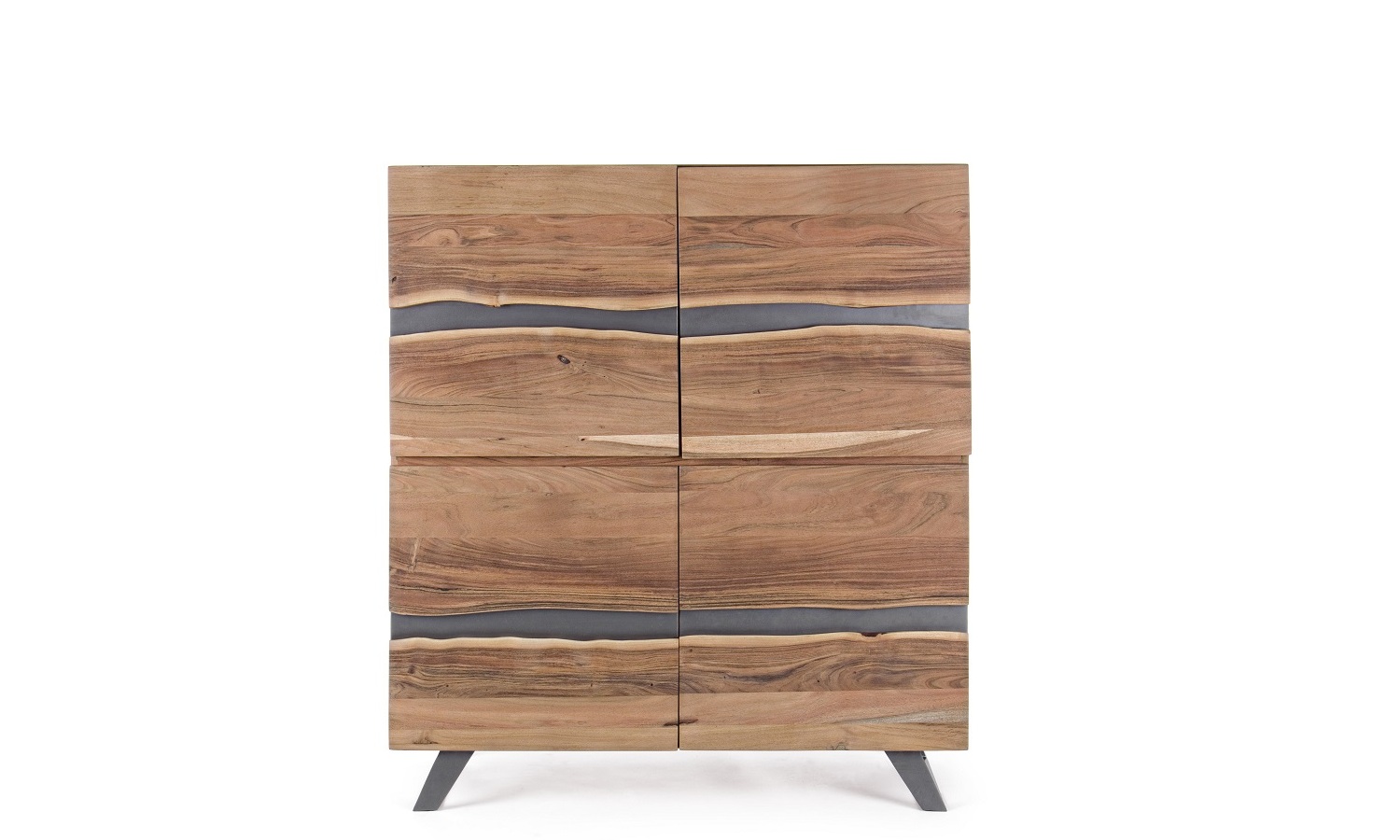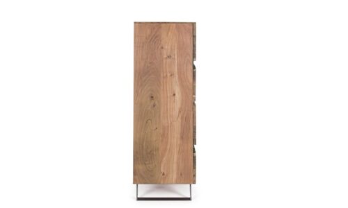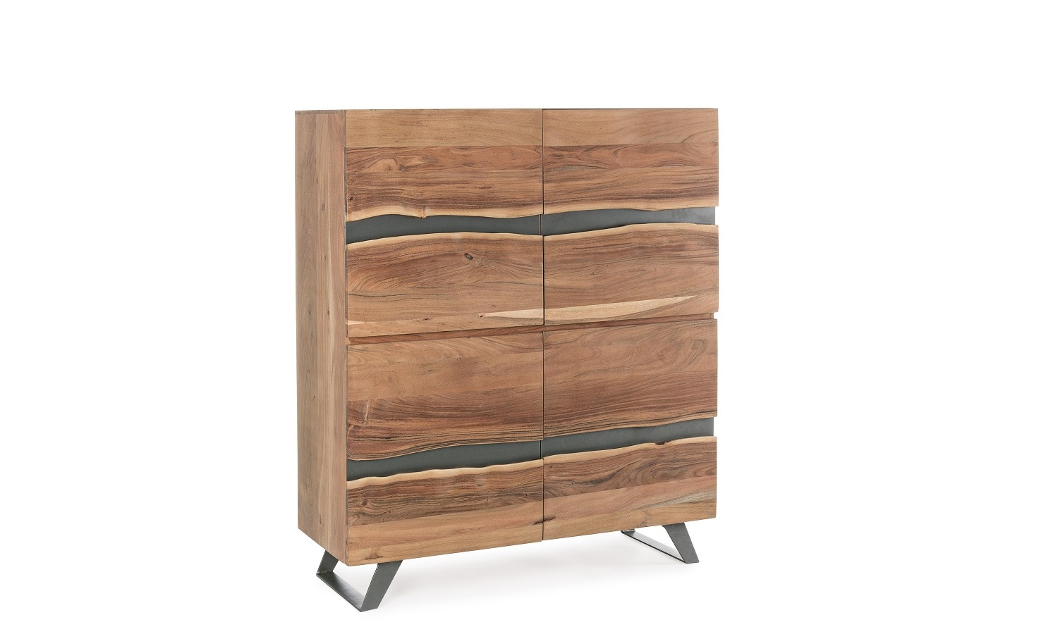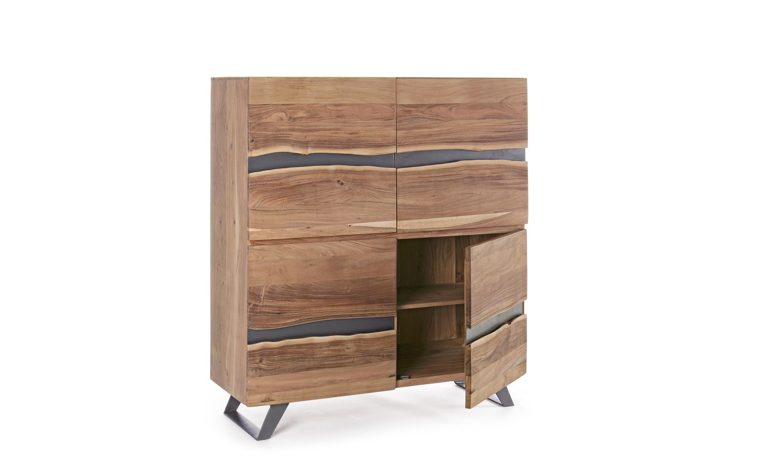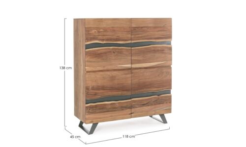 Funcionalidad, diseño y carácter se unen en este aparador alto de 118 cm de ancho, fabricado en madera maciza de acacia y diseñado para destacar en cualquier estancia. Su diseño moderno con toques naturales incorpora puertas con bordes sin cantear en el centro y elegantes inserciones metálicas horizontales, creando un efecto visual único tipo «río» que resalta la veta natural de la madera.