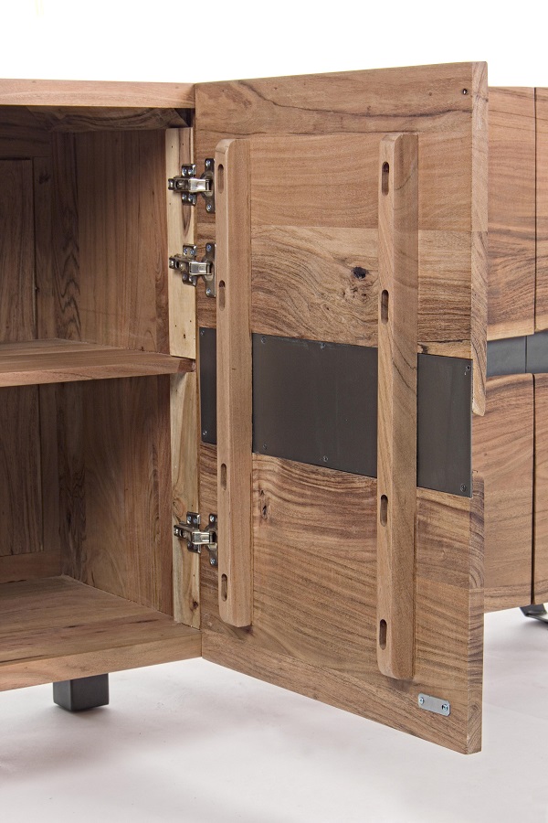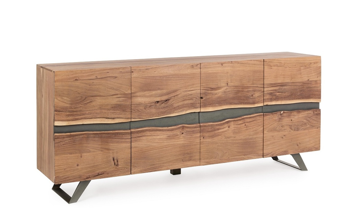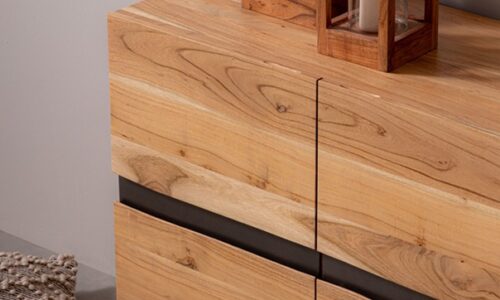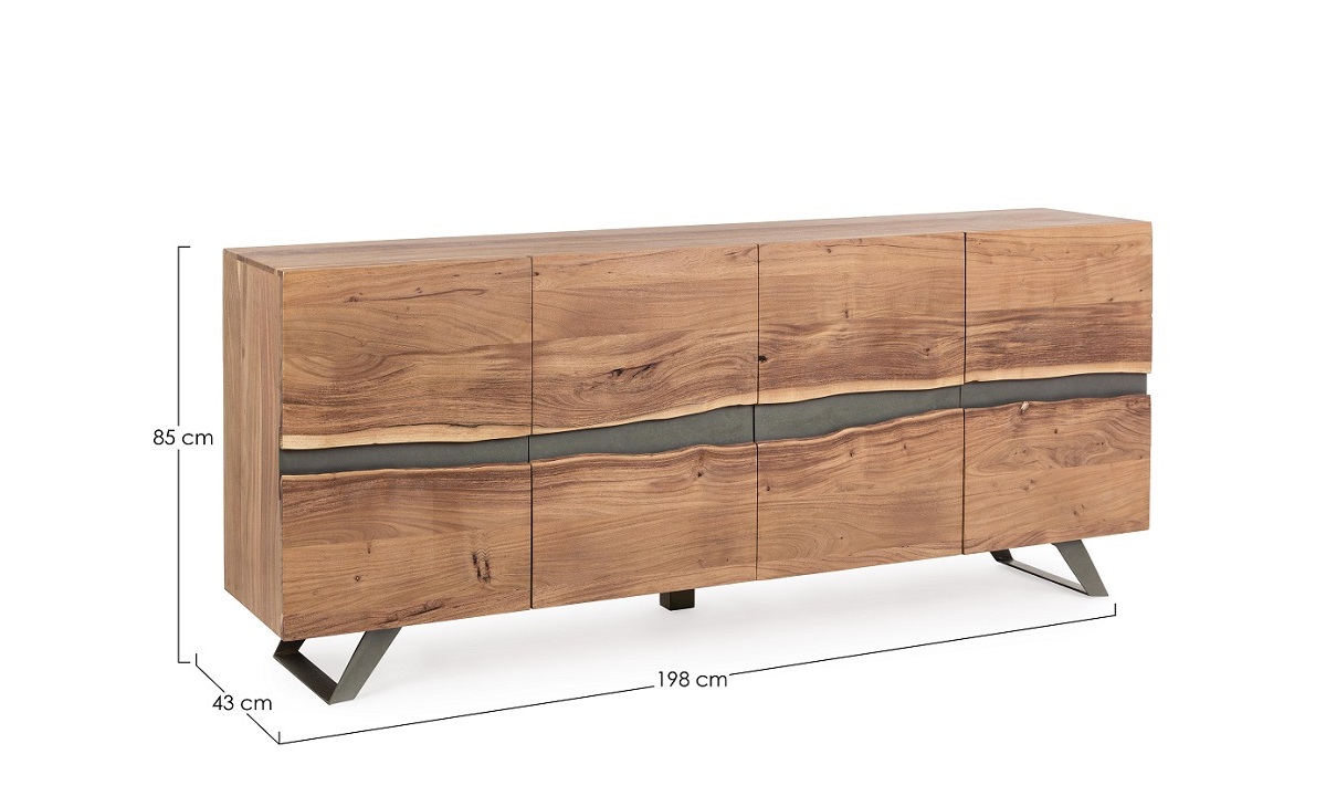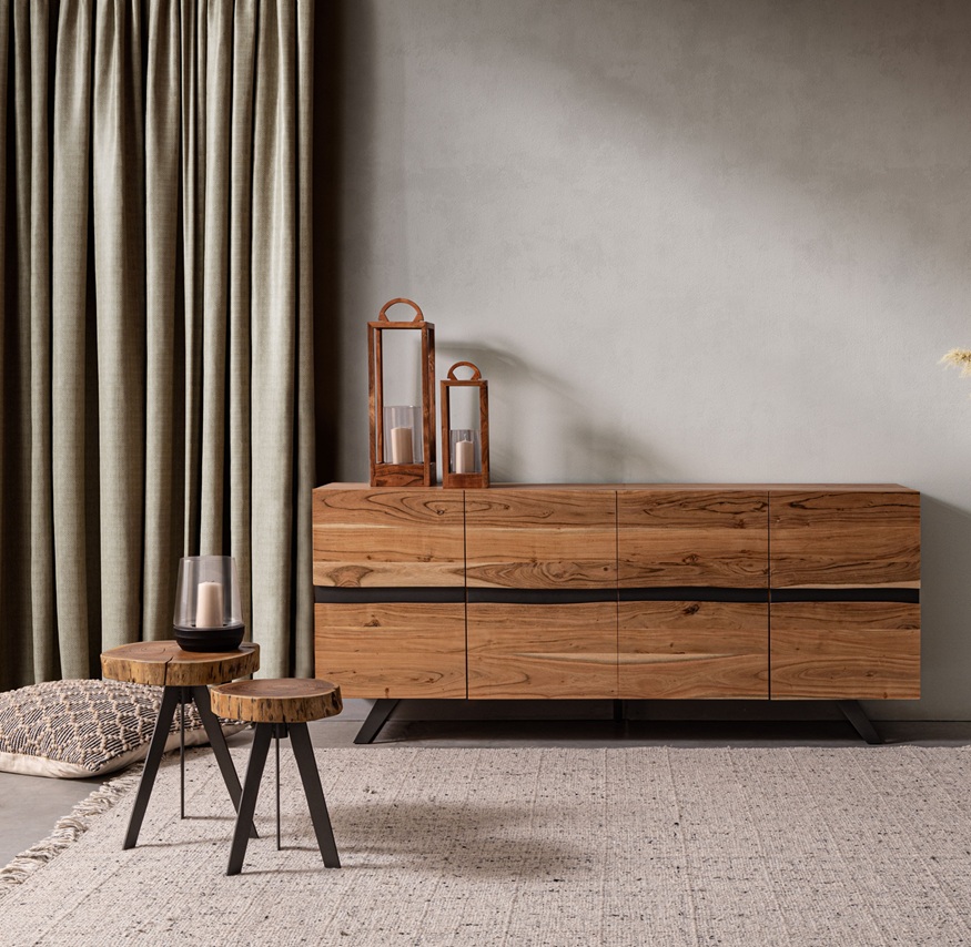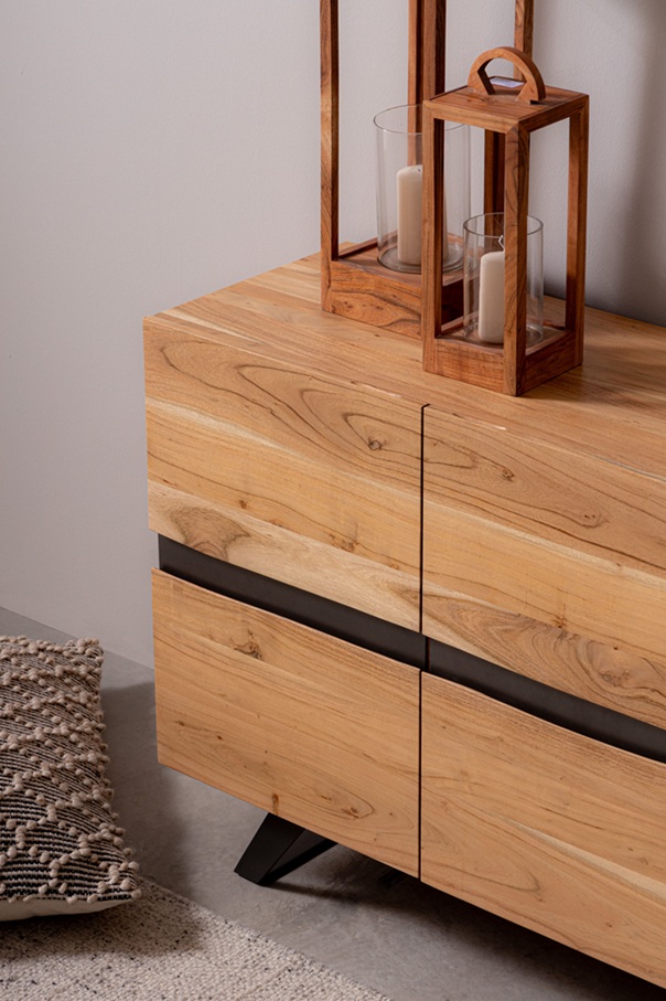 Dale personalidad y carácter a tu espacio con este aparador de diseño único de 198 cm de ancho. Fabricado con una sólida estructura de madera de acacia, este mueble destaca por sus puertas con bordes sin cantear en el centro, creando un efecto natural e irregular que realza la veta de la madera y le da un aire artesanal y auténtico.