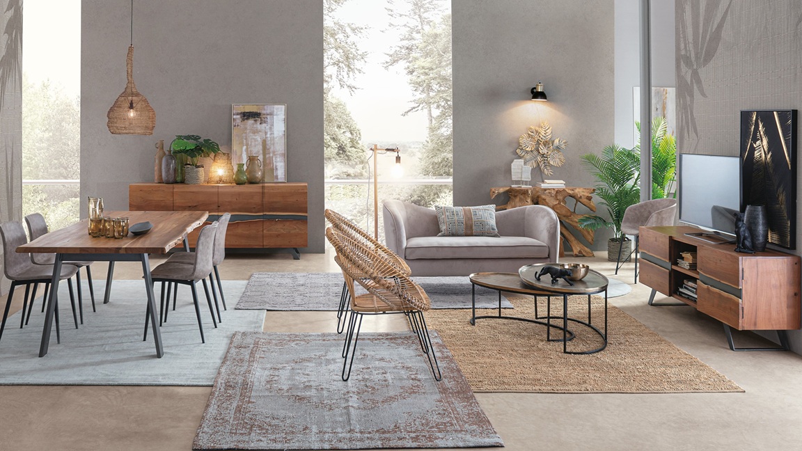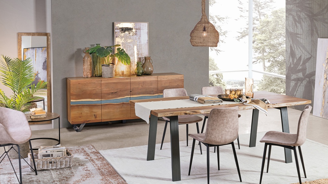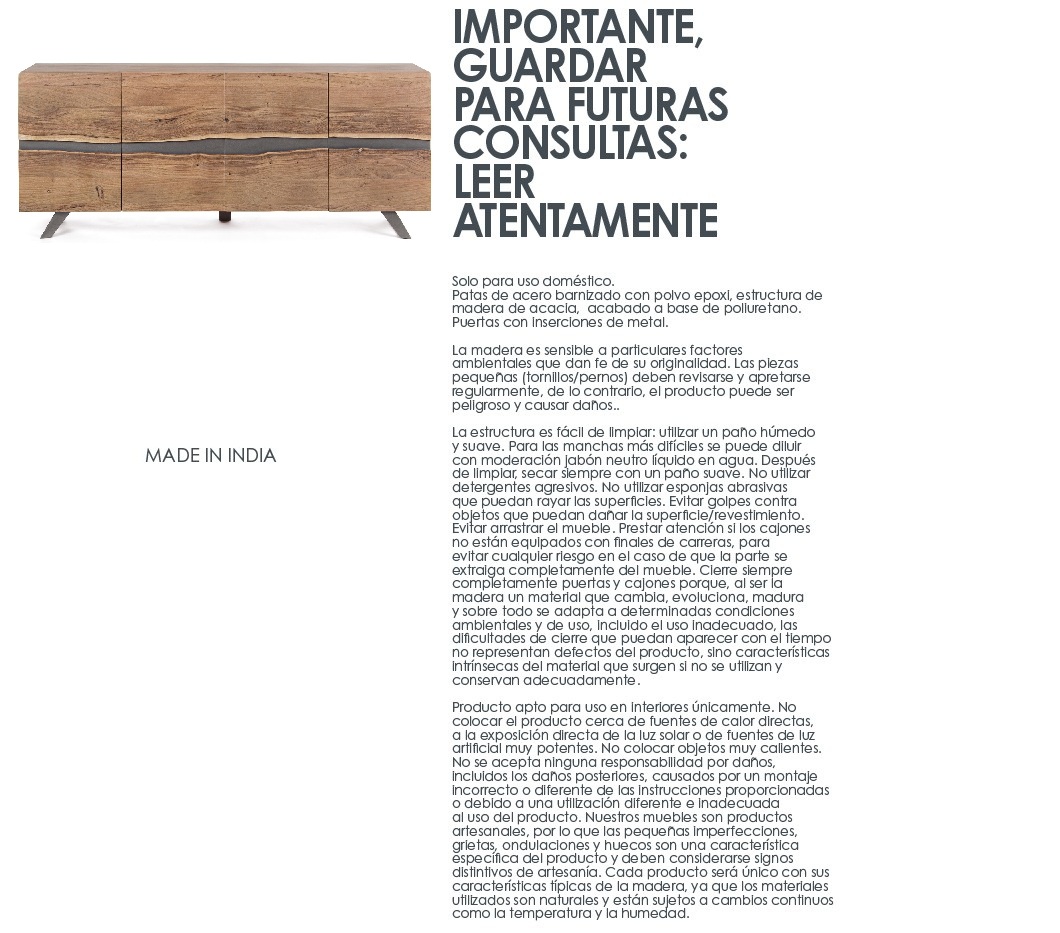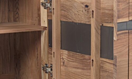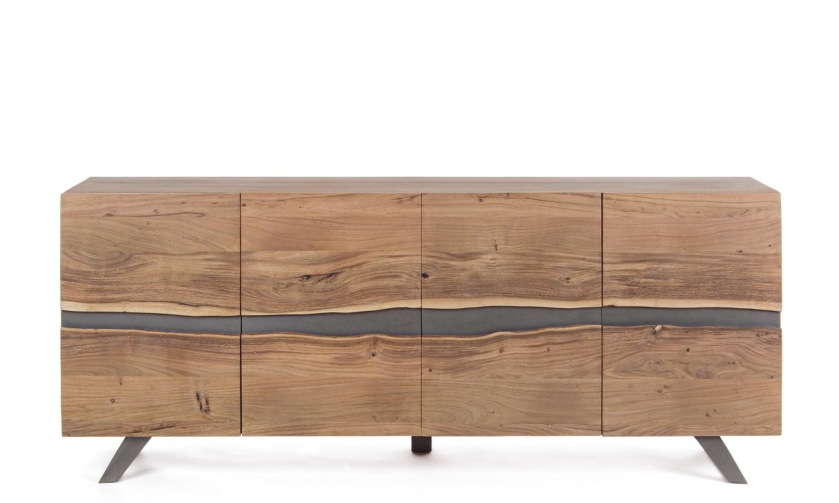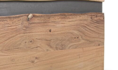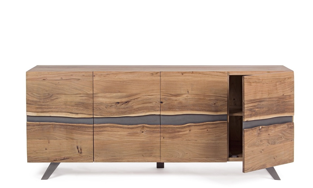 Dale personalidad y carácter a tu espacio con este aparador de diseño único de 198 cm de ancho. Fabricado con una sólida estructura de madera de acacia, este mueble destaca por sus puertas con bordes sin cantear en el centro, creando un efecto natural e irregular que realza la veta de la madera y le da un aire artesanal y auténtico.