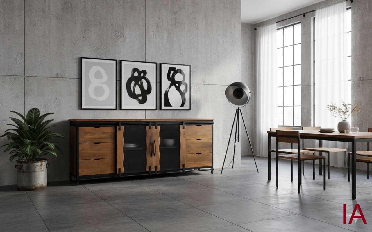 El APARADOR AURA es la pieza que define la personalidad de un hogar. Combina la fuerza de la estructura de acero negro con la audacia del vidrio estriado y la calidez natural del mango con cantos orgánicos. Si buscas un mueble que grite personalidad, solidez y un estilo industrial elevado que no solo almacena, sino que exhibe con clase, ¡el AURA es el golpe de efecto que NECESITAS! 🏆