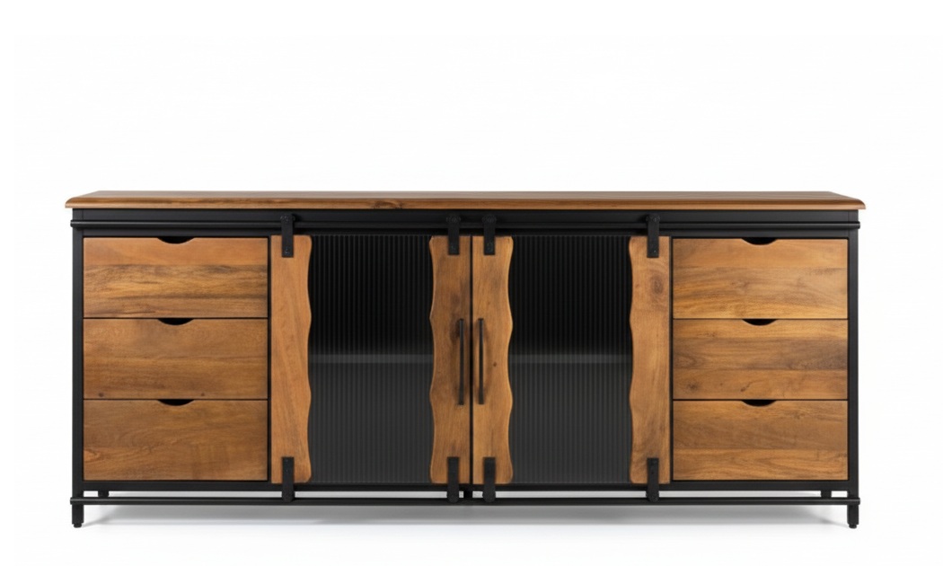 APARADOR AURA (190 CM): ACERO NEGRO. VIDRIO ESTRIADO Y MADERA DE MANGO. ¡EL DISEÑO INDUSTRIAL GLAM QUE DOMINA TU ESPACIO! 🏭✨