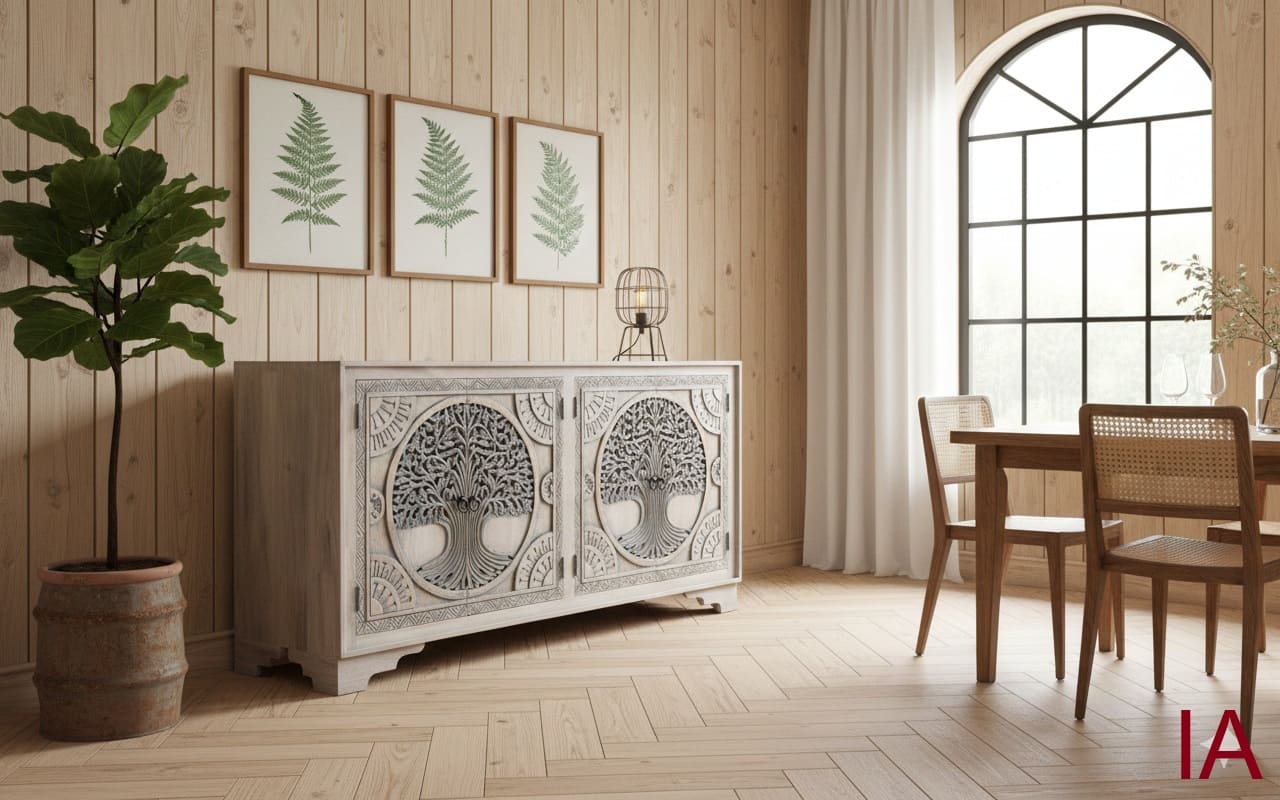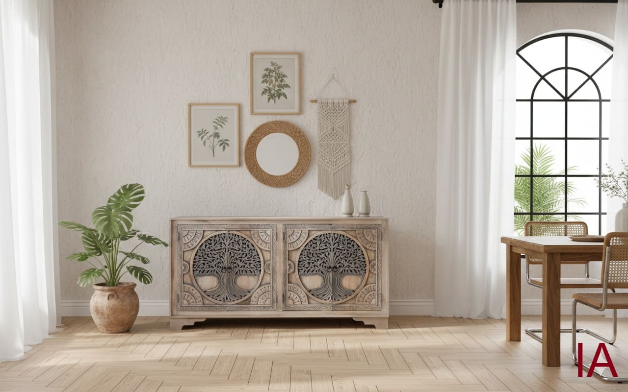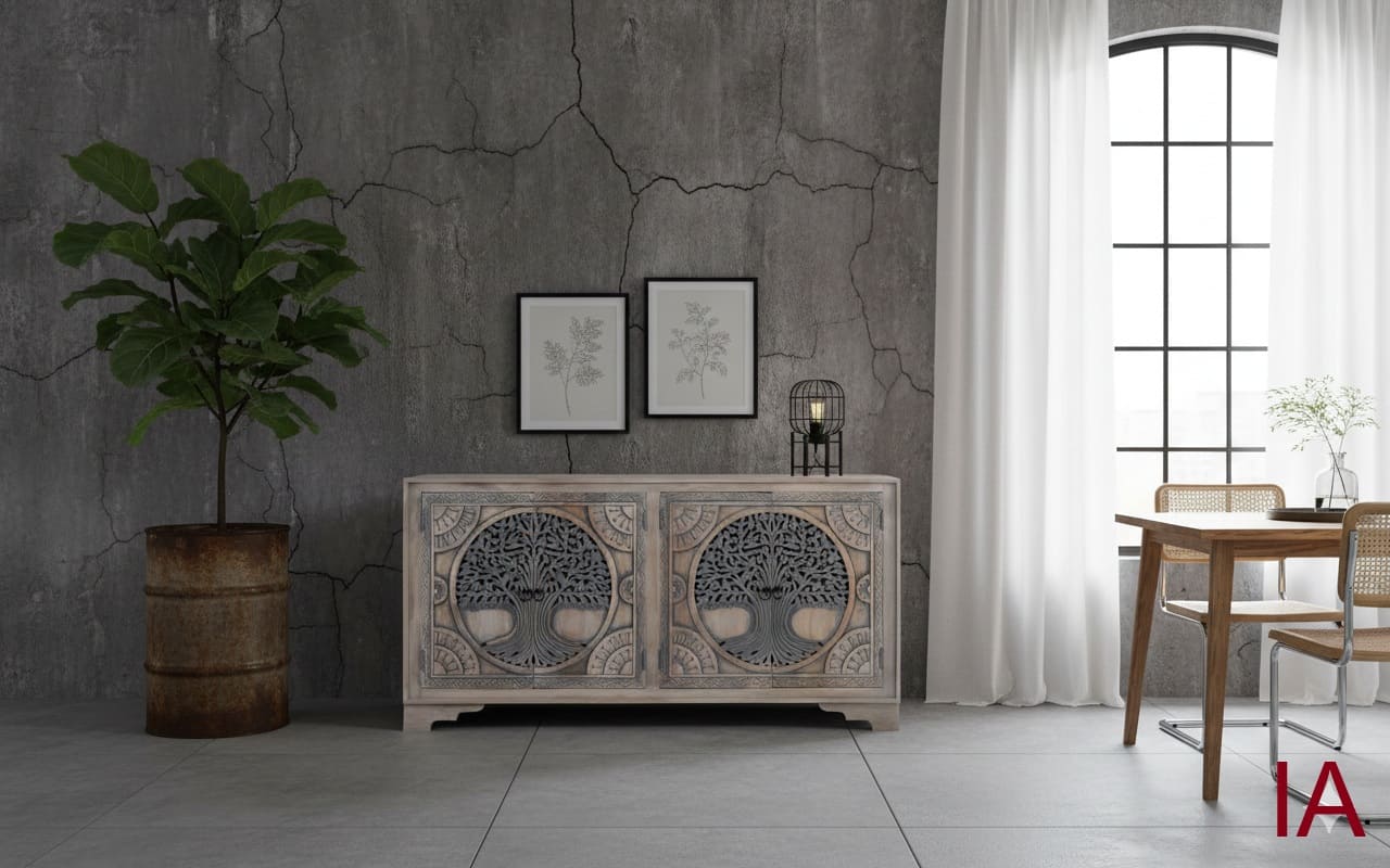 APARADOR BANYAN (180 CM): MADERA MACIZA DE MANGO, TALLADO ARTESANAL «ÁRBOL DE LA VIDA» Y ACABADO SEMI-BLANQUEADO. ¡LA PIEZA DE COLECCIONISTA QUE TU CASA EXIGE PARA DESTACAR! 🌳✨🏛️