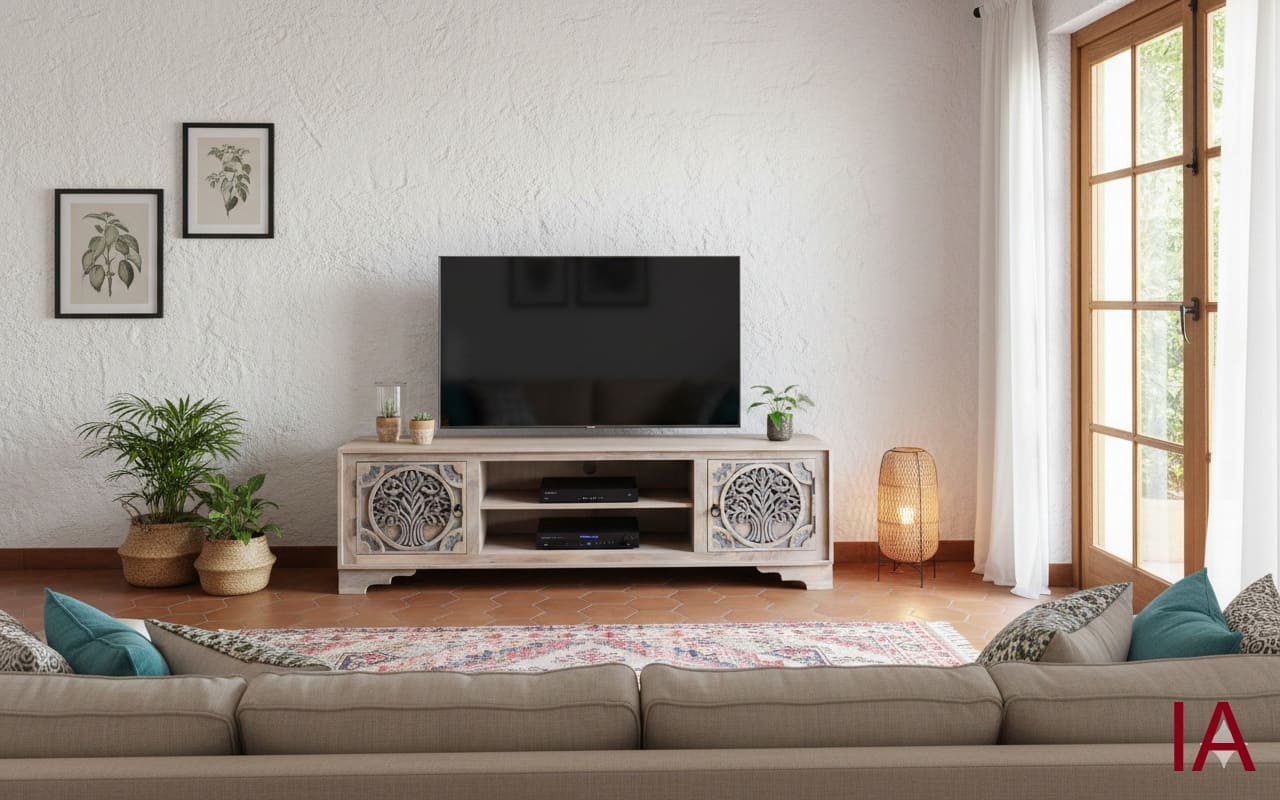 MUEBLE PARA TV BANYAN (180 CM): MADERA MACIZA DE MANGO, TALLADO ARTESANAL «ÁRBOL DE LA VIDA» Y ACABADO SEMI-BLANQUEADO. ¡LA PIEZA DE AUTOR QUE TU HOGAR EXIGE PARA DESTACAR! 📺🌳✨