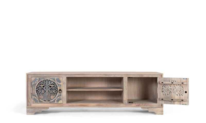 Este mueble de TV está elaborado en madera de mango, con un acabado en tono natural que resalta su textura y color orgánico, con una estructura equilibrada que presenta una puerta en cada costado y un hueco central abierto, las puertas están finamente talladas con una figura del árbol de la vida. Los tiradores metálicos en forma de anilla refuerzan su estilo rústico, mientras que un repie remata la base del mueble, otorgándole un acabado elegante y cuidadosamente detallado.