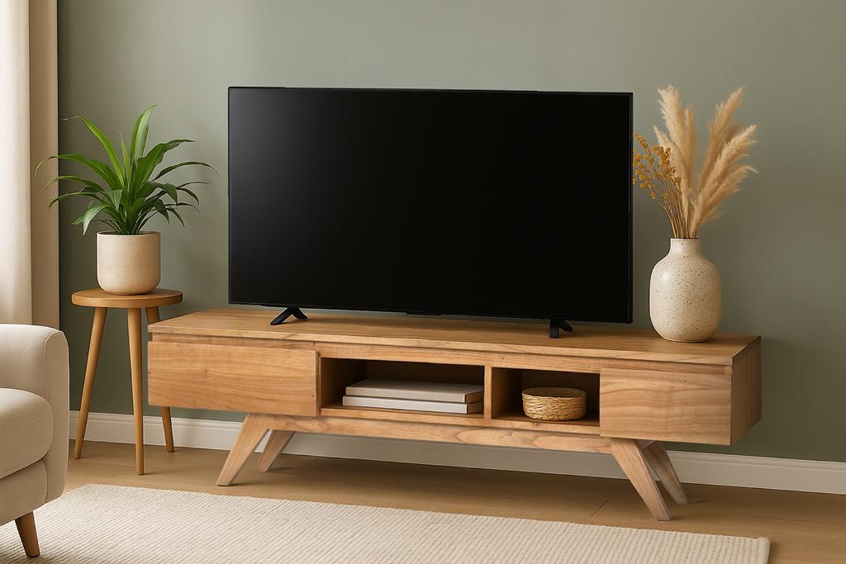 Su diseño bajo y alargado (150 cm) encaja a la perfección bajo televisores de gran formato, y sus patas anguladas le dan un toque contemporáneo y ligero, ideal para estilos nórdicos, modernos o mid-century.