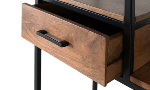 ESTANTES Y CAJONES EN MANGO MACIZO: 🥭 La madera de mango, con su acabado natural y vetas visibles, inyecta una calidez orgánica que contrasta perfectamente con el metal.