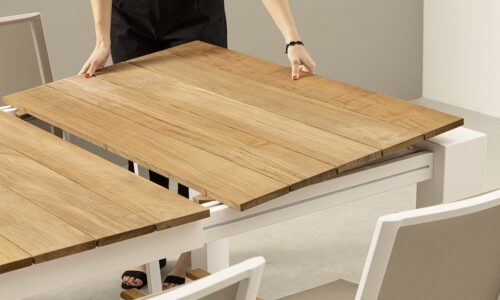 Porque ofrece el equilibrio perfecto entre funcionalidad, diseño y resistencia. Su combinación de aluminio y teca la hace un ícono de estilo contemporáneo, mientras que su sistema extensible garantiza que siempre tengas espacio suficiente para todos.