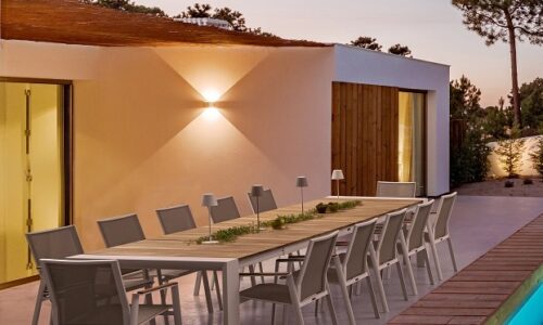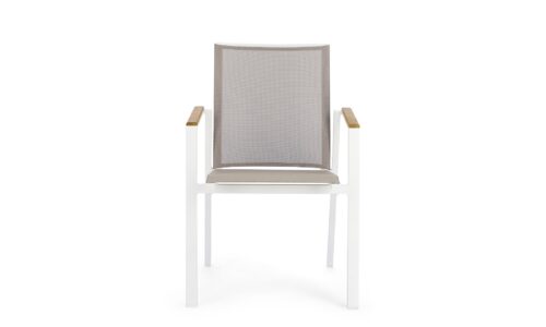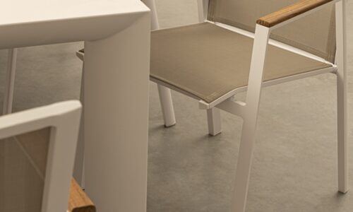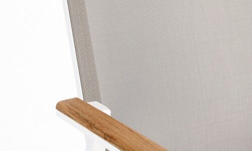 Los reposabrazos con inserciones de teca añaden un toque cálido y natural, mientras que el asiento y respaldo tapizados en Textilene Phifer 1×1 garantizan confort, transpirabilidad y resistencia al sol, la humedad y el uso intensivo.