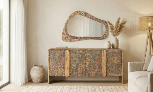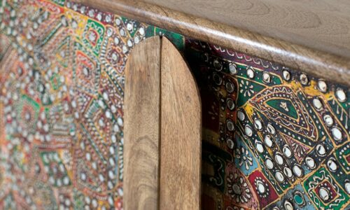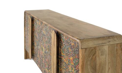 APARADOR CHANTIK (161 CM): MADERA MACIZA DE MANGO, ACABADO ÉTNICO MULTICOLOR Y DETALLES EN ESPEJO. ¡EL SÍMBOLO DE EXCLUSIVIDAD QUE TU CASA EXIGE PARA DESTACAR! 🎨✨🏛️