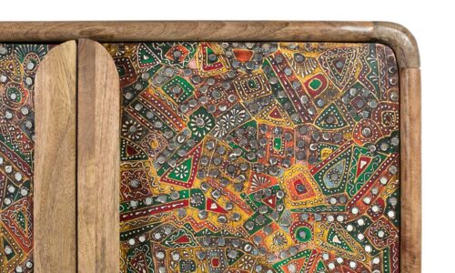 FRONTIS ESCULTÓRICO MULTICOLOR: 🎨 Una auténtica obra de arte. Su fachada está ricamente decorada con un mosaico de patrones geométricos y florales, pintados artesanalmente en tonos vivos que irradian energía, ✨ incorporando pequeños espejos y apliques metálicos que aportan juegos de brillo y texturas únicas, elevando el mueble a la categoría de joya decorativa.