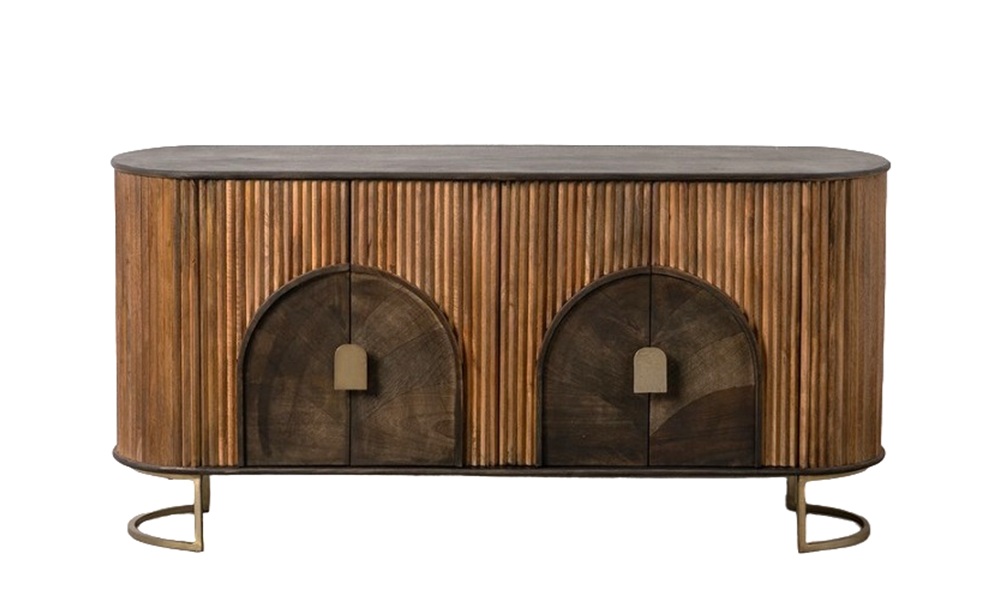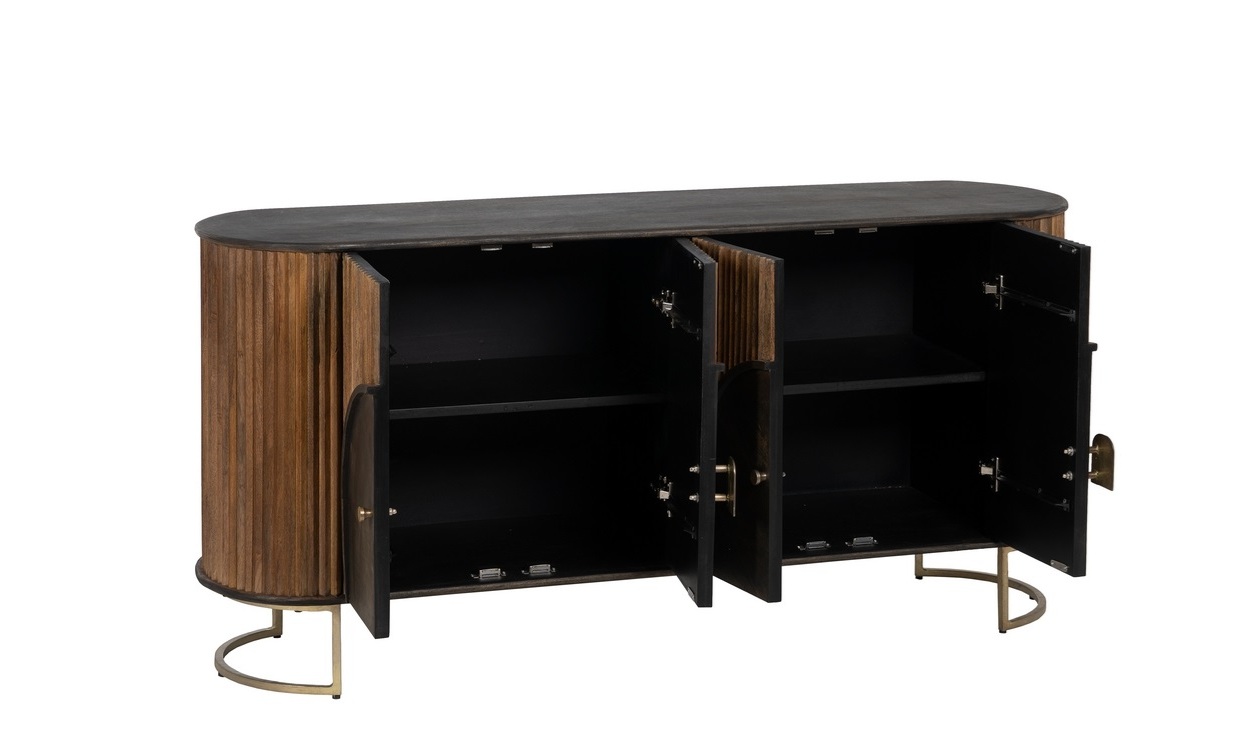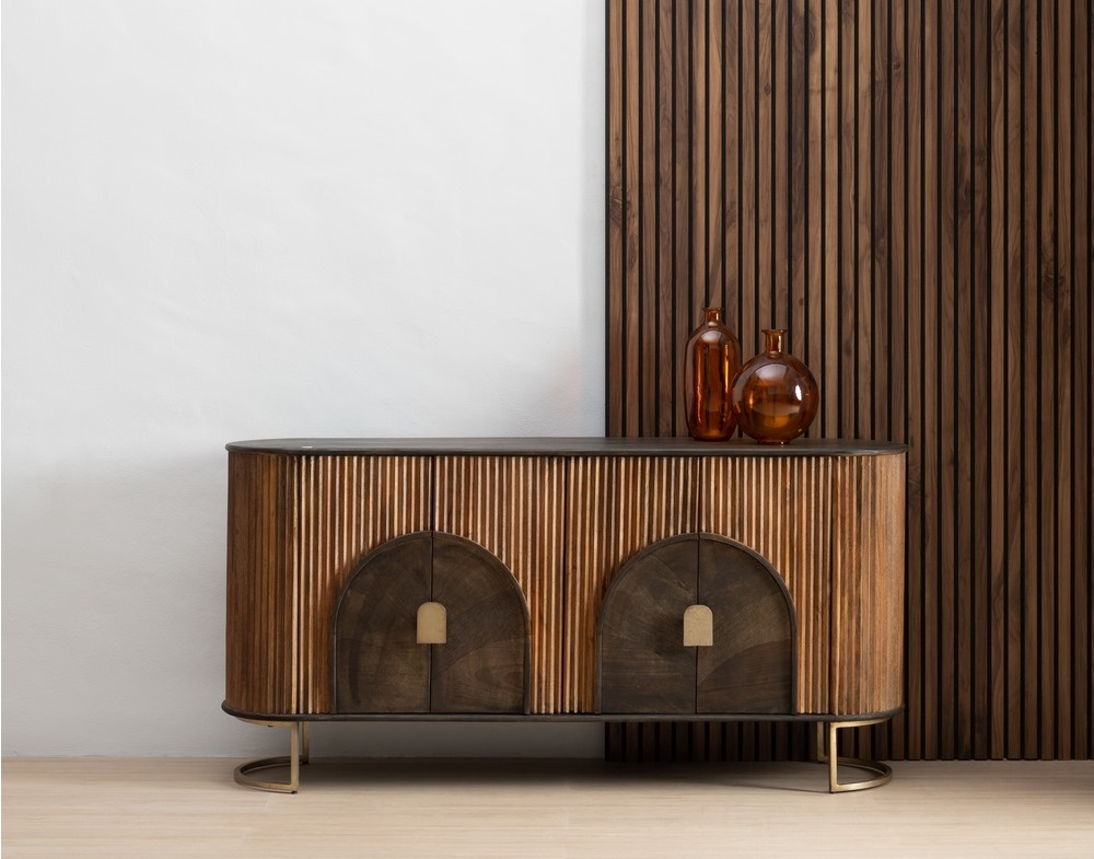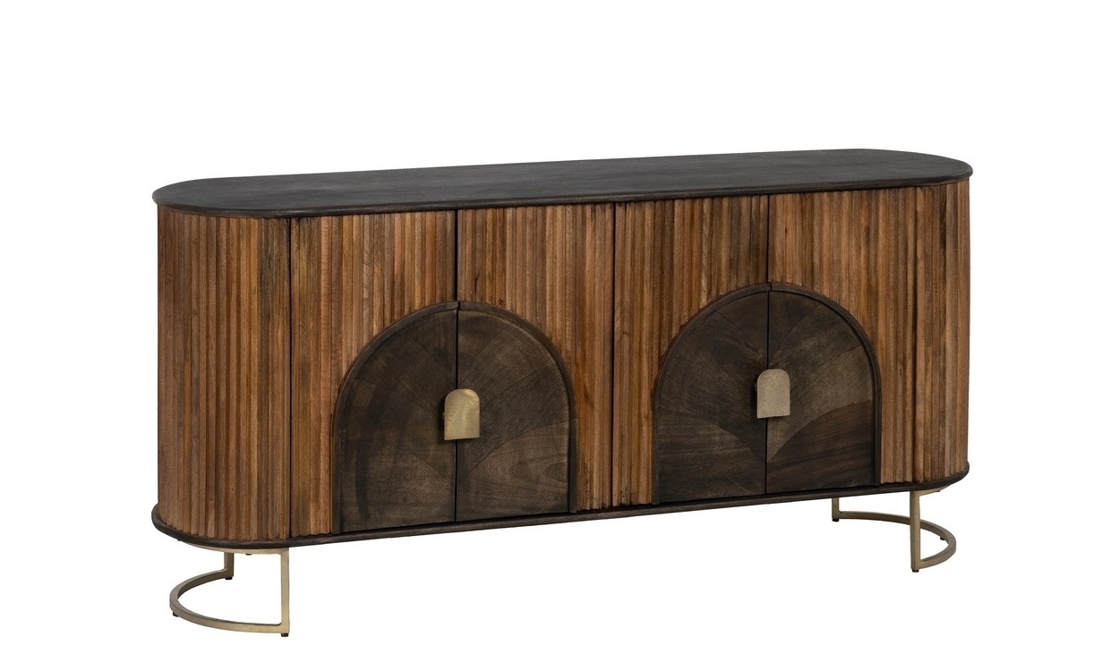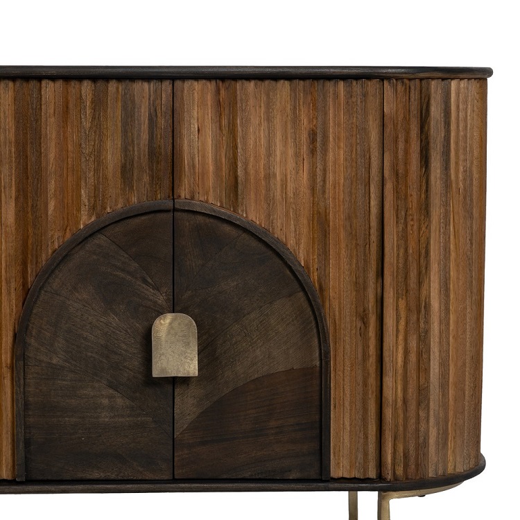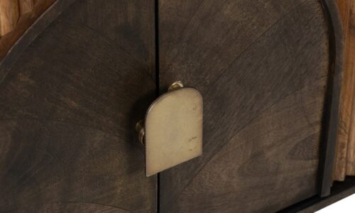 El aparador Chopta es una pieza artesanal de estilo colonial que se fusiona con tendencias naturales, y que hace que encaje fácilmente en la estancia escogida. Configurado con 4 puertas y con los costados curvados, con acabado bicolor, está fabricado con madera de mango, y con los píes metálicos acabado dorado.
