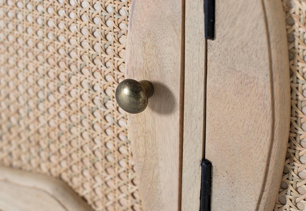 4 PUERTAS CON REJILLA NATURAL TRENZADA: 🌿 ¡LA CLAVE DE LA TENDENCIA! Los frentes están forrados en rejilla natural trenzada, aportando ligereza visual, textura exquisita y un aire Boho/Mediterráneo de alta costura.