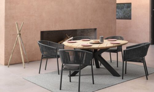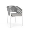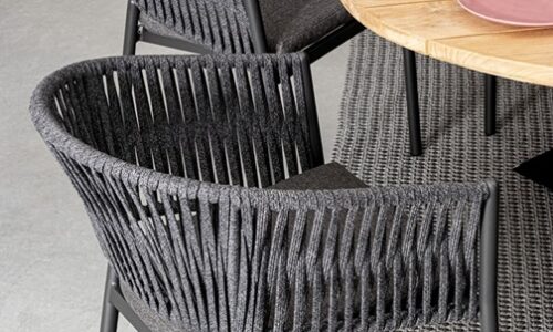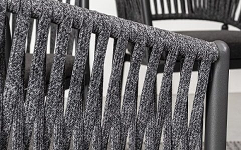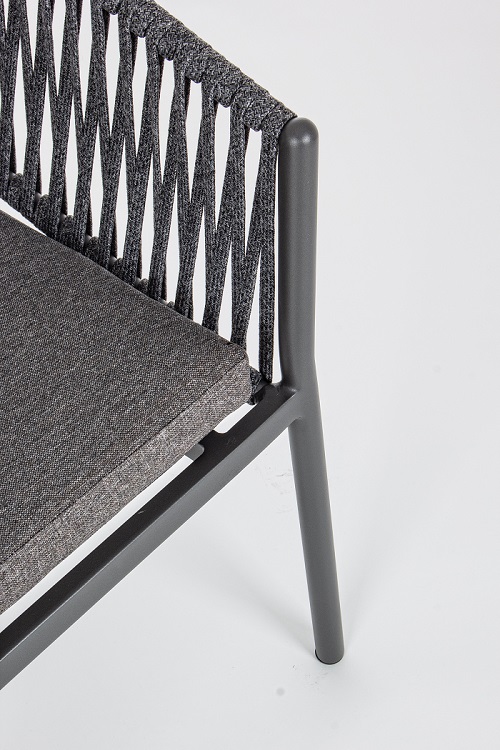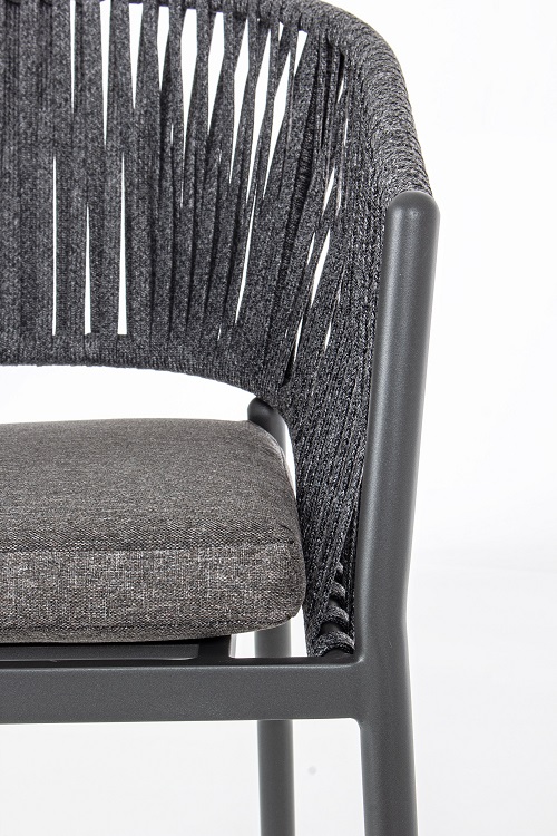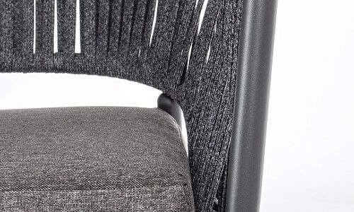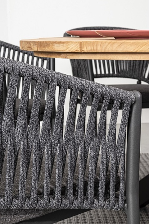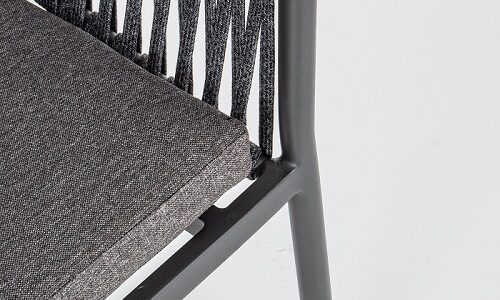El respaldo y los laterales están trabajados con un trenzado artesanal de cuerda de Tetoron (100% poliéster) que aporta textura, estilo y un aire contemporáneo. Su cojín desenfundable de tejido repelente al agua Olefín (100% polipropileno) garantiza comodidad y fácil mantenimiento, además de estar diseñado para resistir la humedad, el sol y el uso intensivo en exterior.