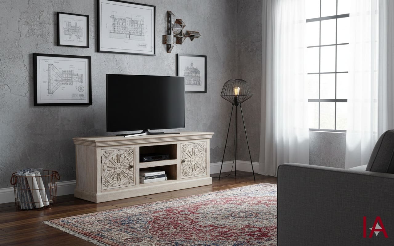 MUEBLE PARA TV GOVA (152 CM): MADERA MACIZA DE MANGO, ACABADO ARENA Y TALLADO ARTESANAL DE ÉLITE. ¡LA PIEZA DE AUTOR QUE TU ESPACIO EXIGE PARA DESTACAR! 📺🏺🏜️✨