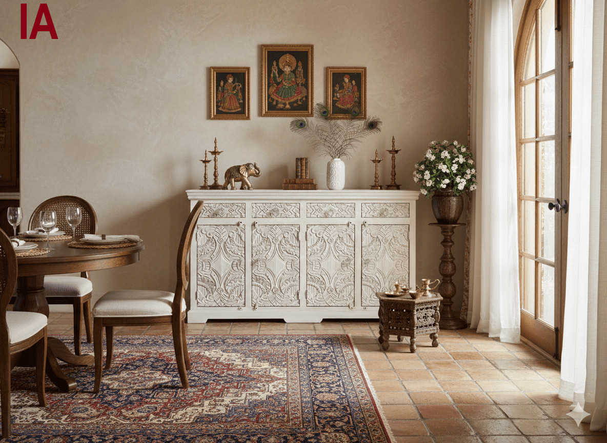 La principal característica de este aparador es la solidez de sus materiales así como un diseño diferenciador, y su peculiaridad se basa en las el tallado artesano en sus puertas y cajones, que hacen de éste mueble una pieza muy singular y plena de estética. Un ejemplo de diseño que destaca por su simplicidad, carácter y naturalidad.