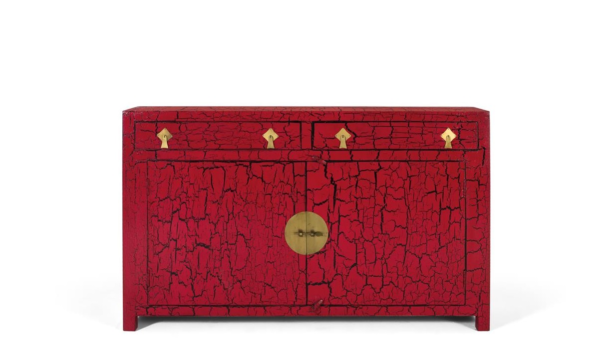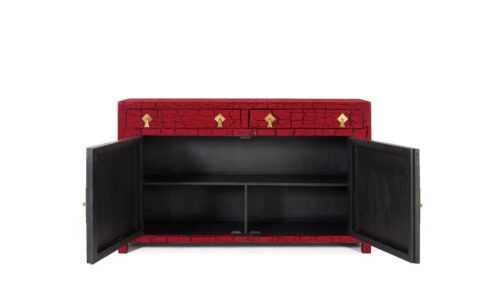 Este aparador es una pieza artesanal de estilo oriental que se fusiona con tendencias minimalistas, y que hace que encaje fácilmente en la estancia escogida. Configurado con dos puertas batientes y dos cajones, y con acabado rojol craquelado, está fabricado con madera de mango y mdf, y con unos originales tiradores que recuerdan a los muebles antiguos.