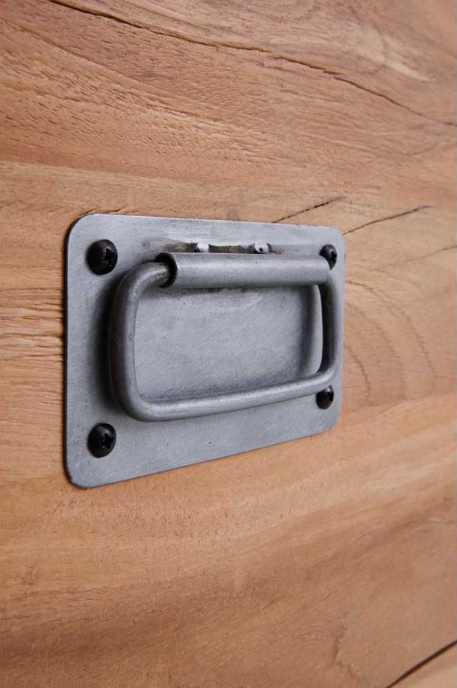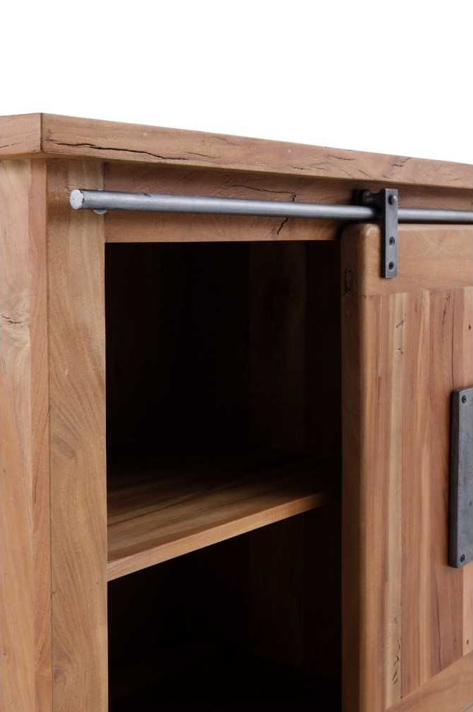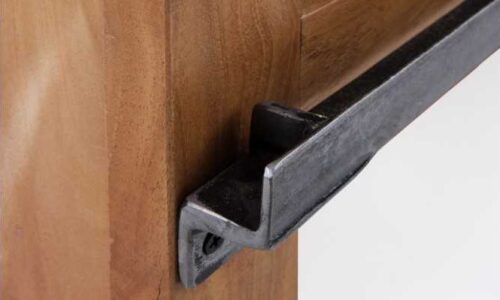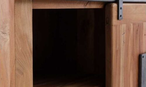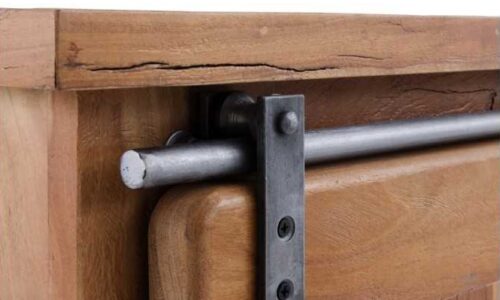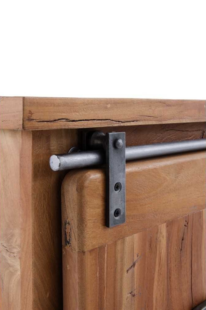 • 1 puerta corredera de madera maciza con decoración metálica, que desliza suavemente sobre sus carriles envejecidos.