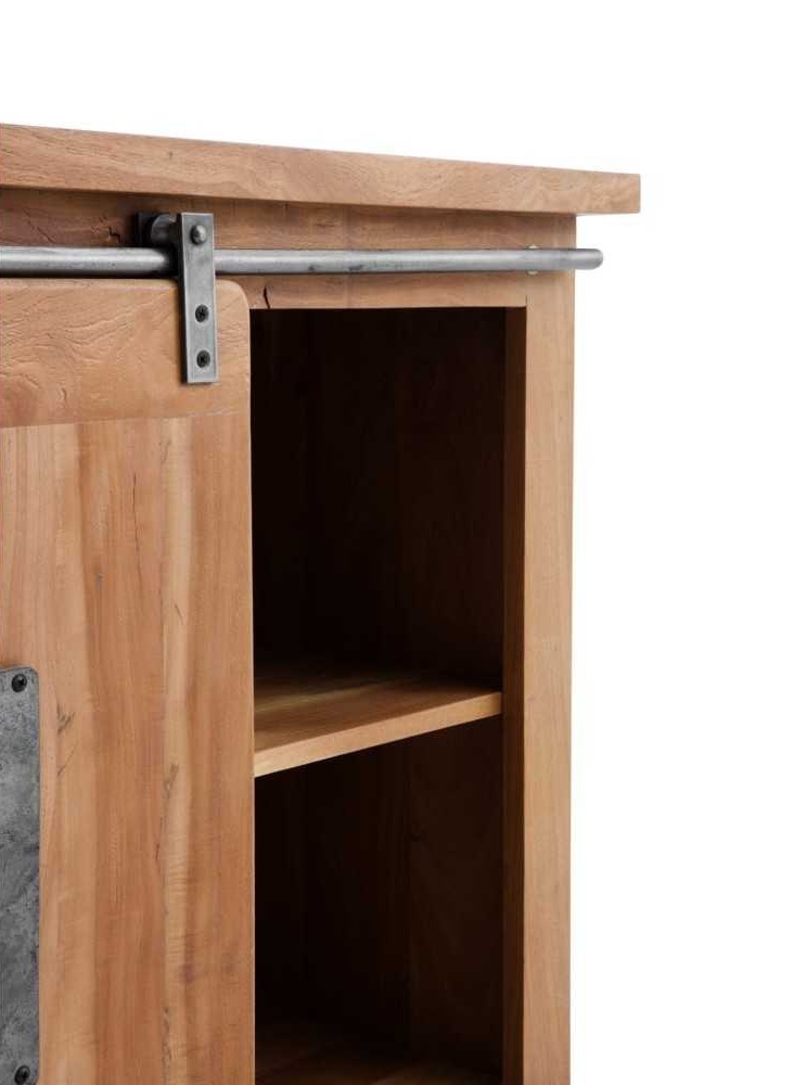 • 2 puertas correderas de madera maciza con placa de decoración metálica, que deslizan suavemente sobre carriles metálicos envejecidos 🛠️.