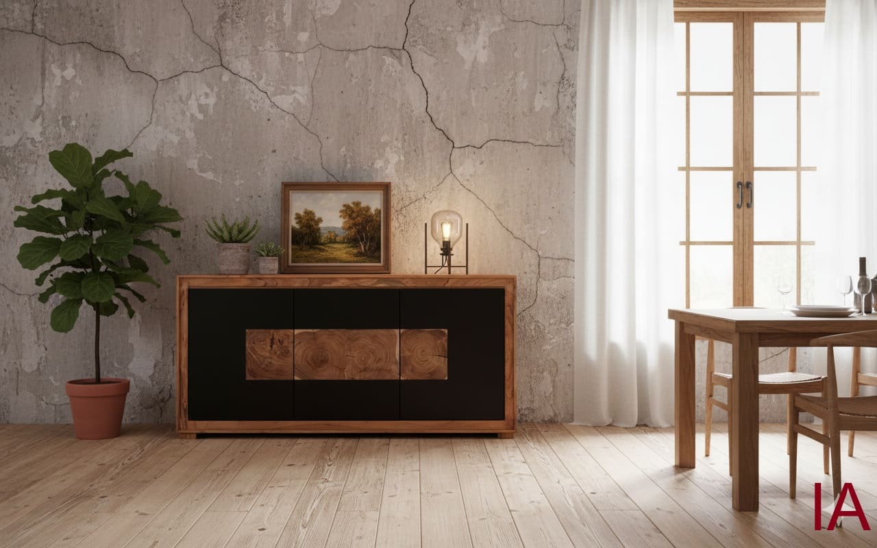 APARADOR JATAYU (190 CM): MADERA DE MANGO MACIZA, FRENTES DE TRONCO NATURAL Y DISEÑO DE VANGUARDIA. ¡LA OBRA MAESTRA QUE TU SALÓN EXIGE! 🌳🌑✨