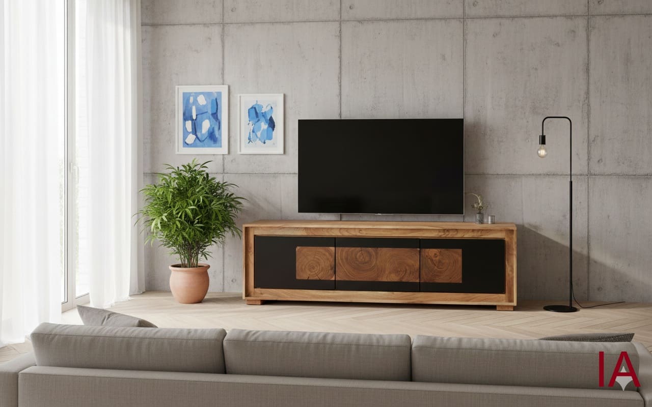 MUEBLE PARA TV JATAYU (160 CM): MADERA DE MANGO MACIZA, FRENTES DE TRONCO REAL Y DISEÑO DE VANGUARDIA. ¡EL TRONO QUE TU SALÓN EXIGE PARA DOMINAR EL ESPACIO! 📺🌳🌑✨