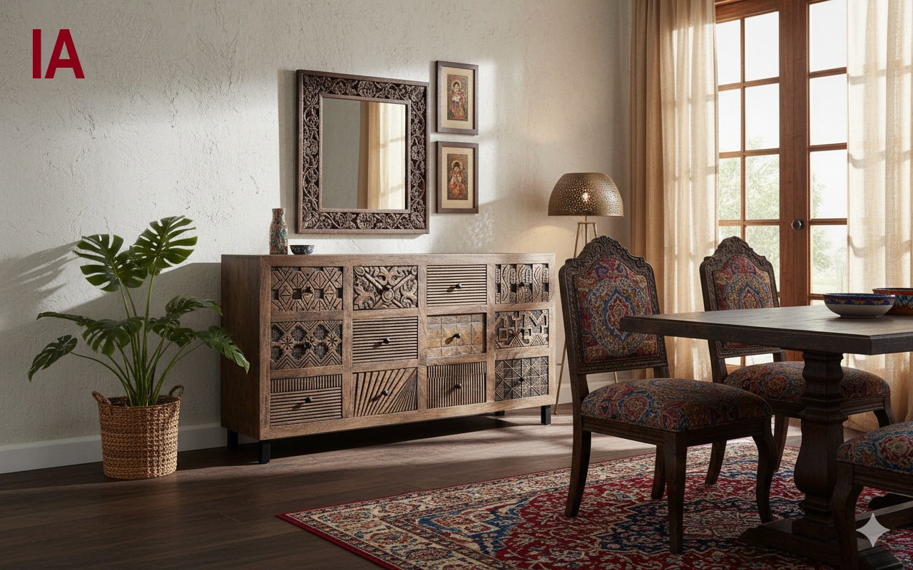 Aparador fabricado en madera de mango maciza con acabado natural, que resalta la textura y tonalidad del material. Está compuesto por múltiples cajones, cada uno con un diseño único tallado a mano en relieve, con motivos geométricos y étnicos que aportan un fuerte carácter decorativo. La base de hierro en color negro añade estabilidad y un contraste moderno que equilibra su estilo artesanal. Ideal como pieza funcional y decorativa en salones, comedores o recibidores de estilo rústico, boho o contemporáneo.