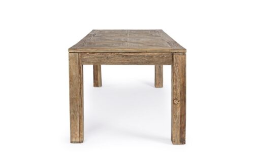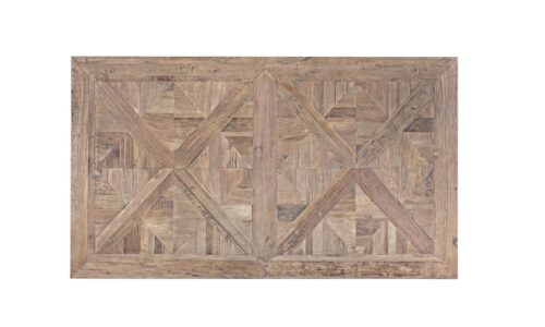 La tapa de parqué con efecto envejecido destaca por su elaborado patrón geométrico, que aporta textura y personalidad a cualquier espacio. Cada mesa es única, con vetas, nudos y detalles propios de la madera reutilizada, lo que la convierte en una verdadera pieza con historia.