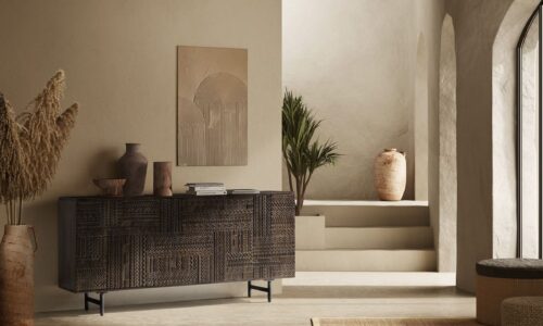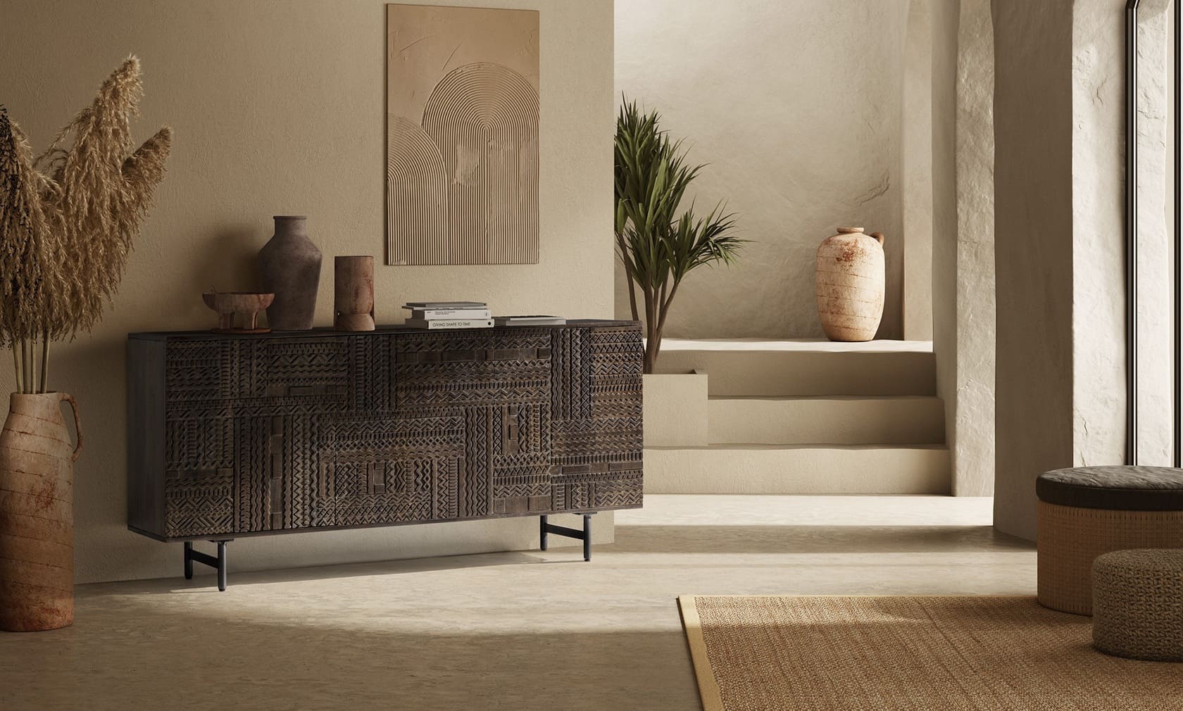 El aparador “KALAI” es una pieza que no pasa desapercibida. Con 3 puertas de apertura por pulsación y un espectacular tallado artesanal geométrico en madera maciza de mango, este mueble se convierte en el centro de todas las miradas.