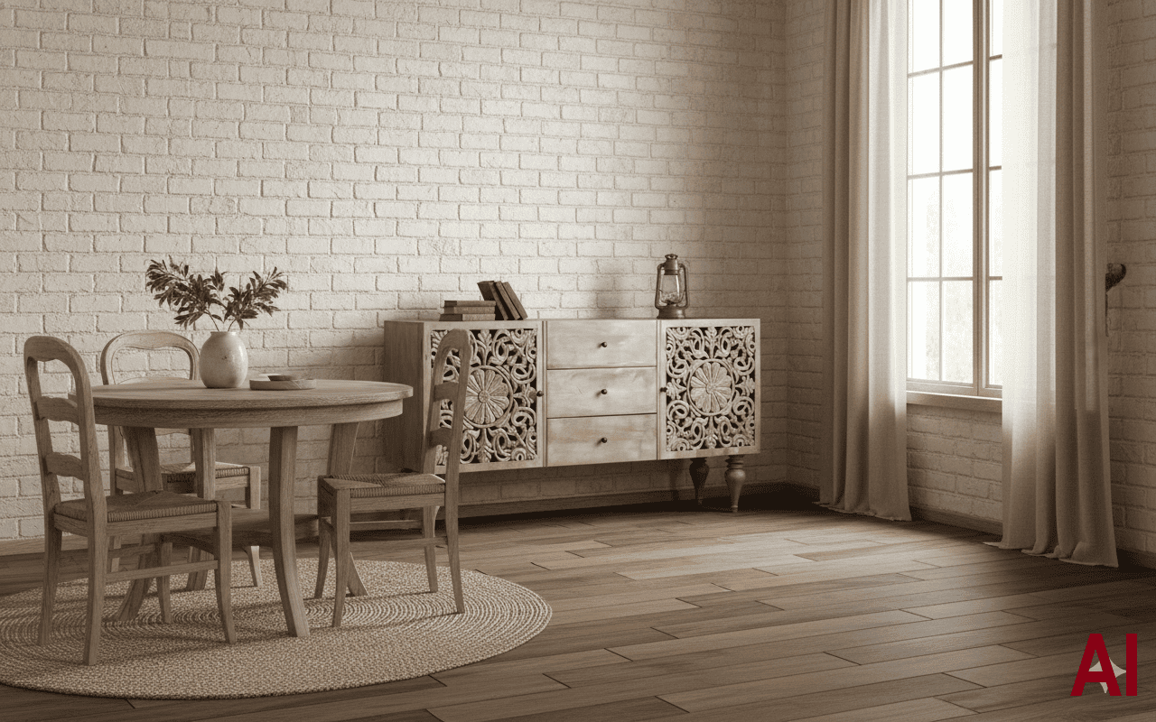 Aparador fabricado en madera de mango, este mueble cuenta con dos puertas laterales talladas a mano, que aportan un toque artesanal y detallado. En el centro, se encuentran tres cajones espaciosos, ideales para mantener organizado cualquier espacio. Sus patas torneadas añaden un aire clásico y refinado, mientras que el acabado en gris decapé realza la textura natural de la madera, brindándole un aspecto vintage y encantador.