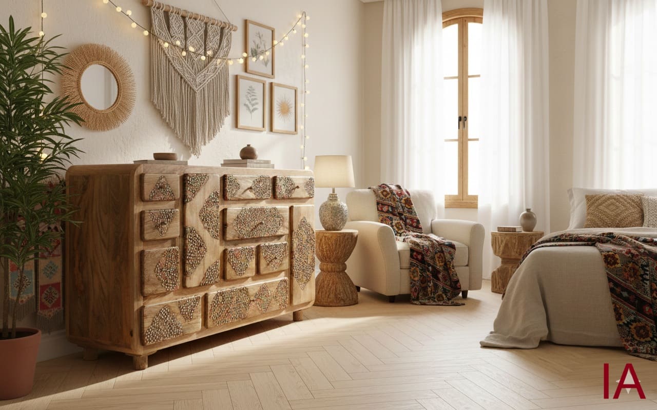 ¿Sigues conformándote con muebles industriales sin alma y aburridos? 🤯 Es hora de dar un golpe de AUTORIDAD VISUAL Y EXCLUSIVIDAD ABSOLUTA. La CÓMODA KALPANA no es un simple mueble de almacenaje; es una EXPLOSIÓN DE ARTE INDIO que fusiona la robustez de la madera de mango con un trabajo de artesanía que deja sin aliento. Si quieres que cada visita se detenga en seco al entrar en tu casa, ¡TIENES QUE HACERTE CON ESTA JOYA AHORA MISMO!