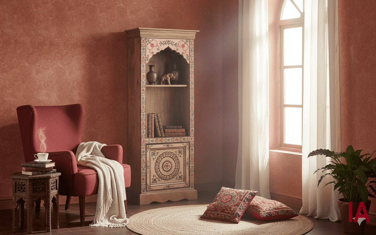 Librería de madera de mango con un encantador diseño artesanal. Presenta una estructura vertical con dos compartimentos abiertos divididos por una balda, y una puerta inferior batiente, ideal para guardar objetos fuera de la vista. El marco frontal está pintado a mano con motivos florales multicolores sobre fondo claro, incluyendo detalles en el copete superior y el zócalo inferior. Ideal como librería o vitrina decorativa, perfecta para interiores de estilo rústico, étnico o vintage.