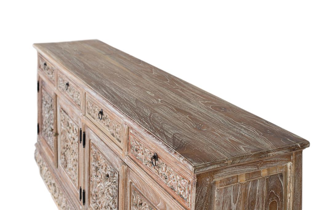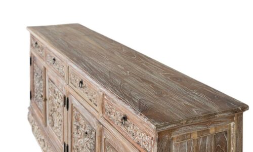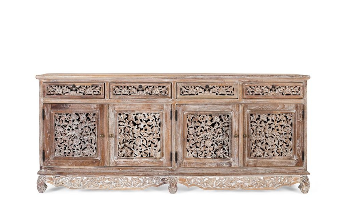 ¿Tu comedor o salón es invisible y sin alma? 🤯 Es hora de un golpe de DISEÑO MONUMENTAL, ARTESANÍA PURA Y PRESENCIA BRUTAL! El APARADOR KAUM no es un mueble; es una ESCULTURA FUNCIONAL construida en teca maciza. Su frontal y base, profusamente CALADOS Y TALLADOS A MANO, garantizan un IMPACTO VISUAL SIN IGUAL. Si buscas una pieza agresiva, funcional y que grite exclusividad, ¡DEBES ADQUIRIR ESTA OBRA MAESTRA AHORA MISMO!