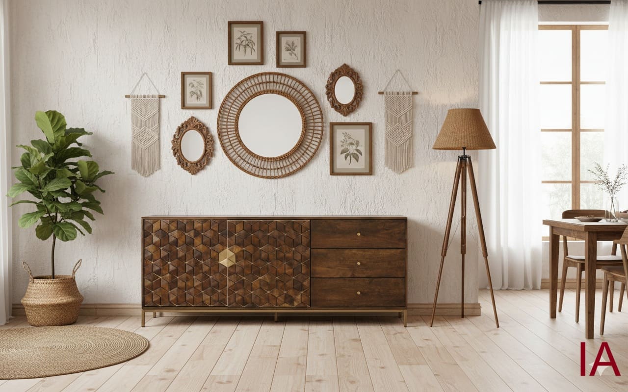 APARADOR KEN (190 CM): MADERA DE MANGO Y NOGAL. DISEÑO GEOMÉTRICO 3D. ¡LA PIEZA MONUMENTAL QUE HARÁ QUE TU SALÓN PAREZCA DE REVISTA! 🌰✨