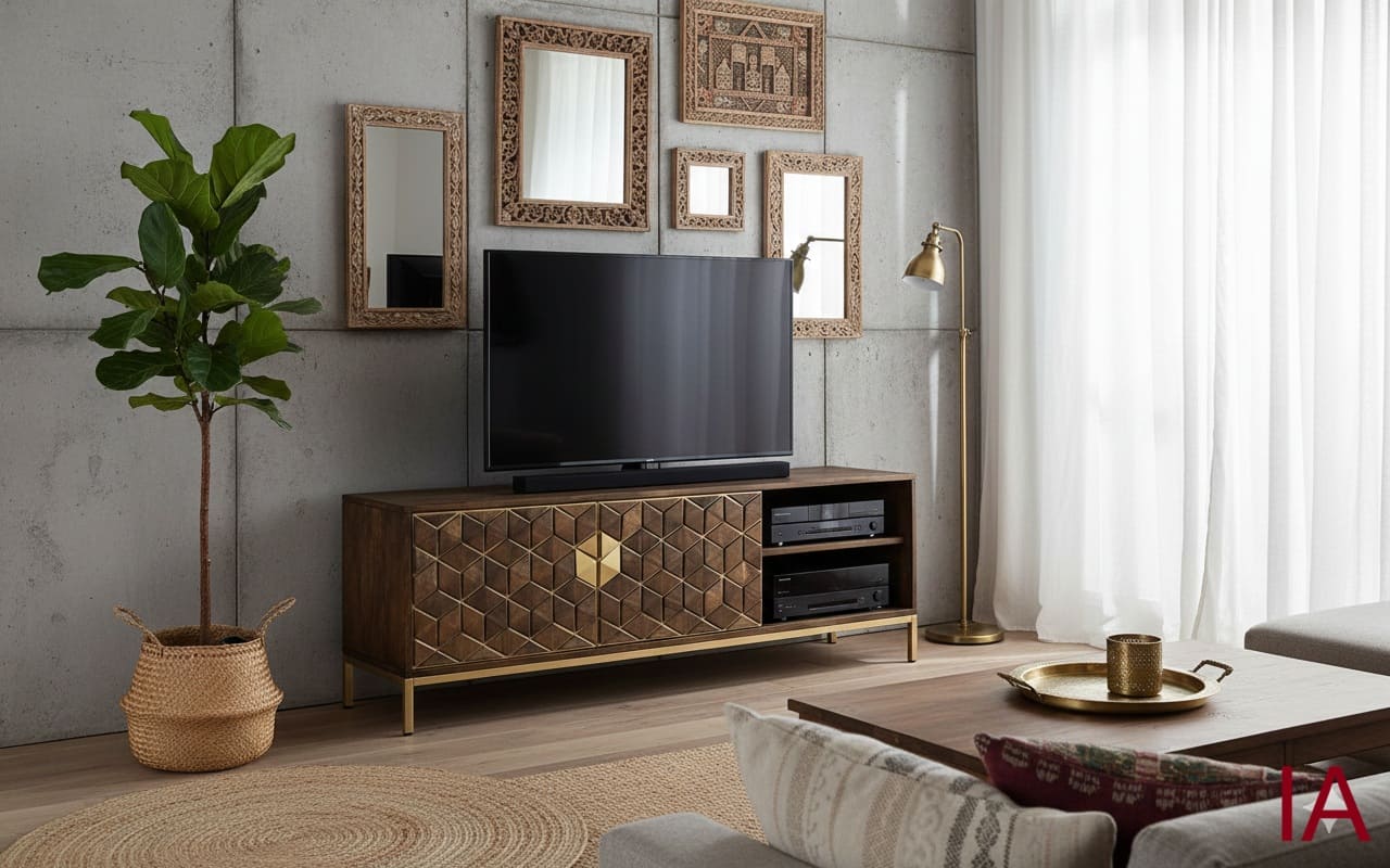 MUEBLE TV KEN (145 CM): MADERA DE MANGO Y NOGAL. DISEÑO GEOMÉTRICO 3D Y DORADO. ¡LA PIEZA MAESTRA QUE REVOLUCIONARÁ TU SALÓN! 📺🌰🏺✨