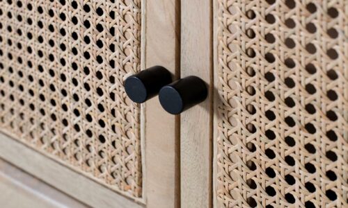 - 4 PUERTAS CON REJILLA NATURAL: 🌿 ¡EL DETALLE ESTRELLA! Los frentes enmarcados con rejilla natural (ratán/mimbre) aportan ligereza visual, un aire artesanal exquisito y un toque Boho/Mediterráneo muy buscado.