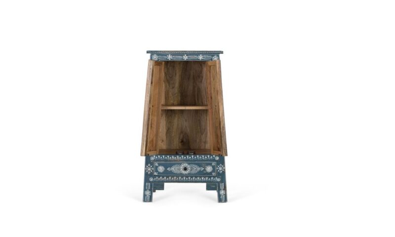 Descubre toda la magia de la artesanía en este mueble auxiliar de madera maciza de mango y MDF. Cuenta con 2 puertas batientes y 1 cajón que proporcionan espacio de almacenamiento. Toda la superficie del mueble está pintada a mano, exhibiendo un diseño artístico y único que refleja una cuidada artesanía. Los detalles pintados a mano incluyen motivos diversos que aportan un toque distintivo y decorativo, haciendo de este mueble no solo una pieza funcional, sino también un elemento decorativo que embellece cualquier espacio.