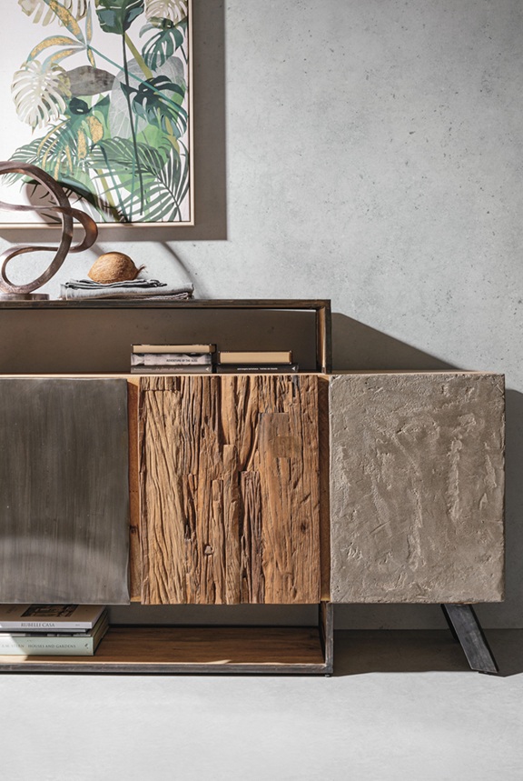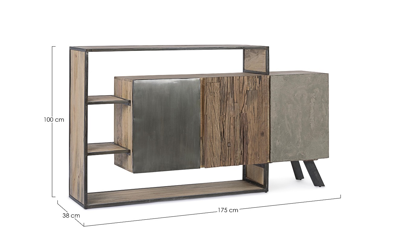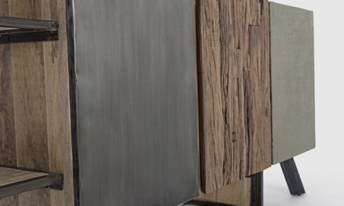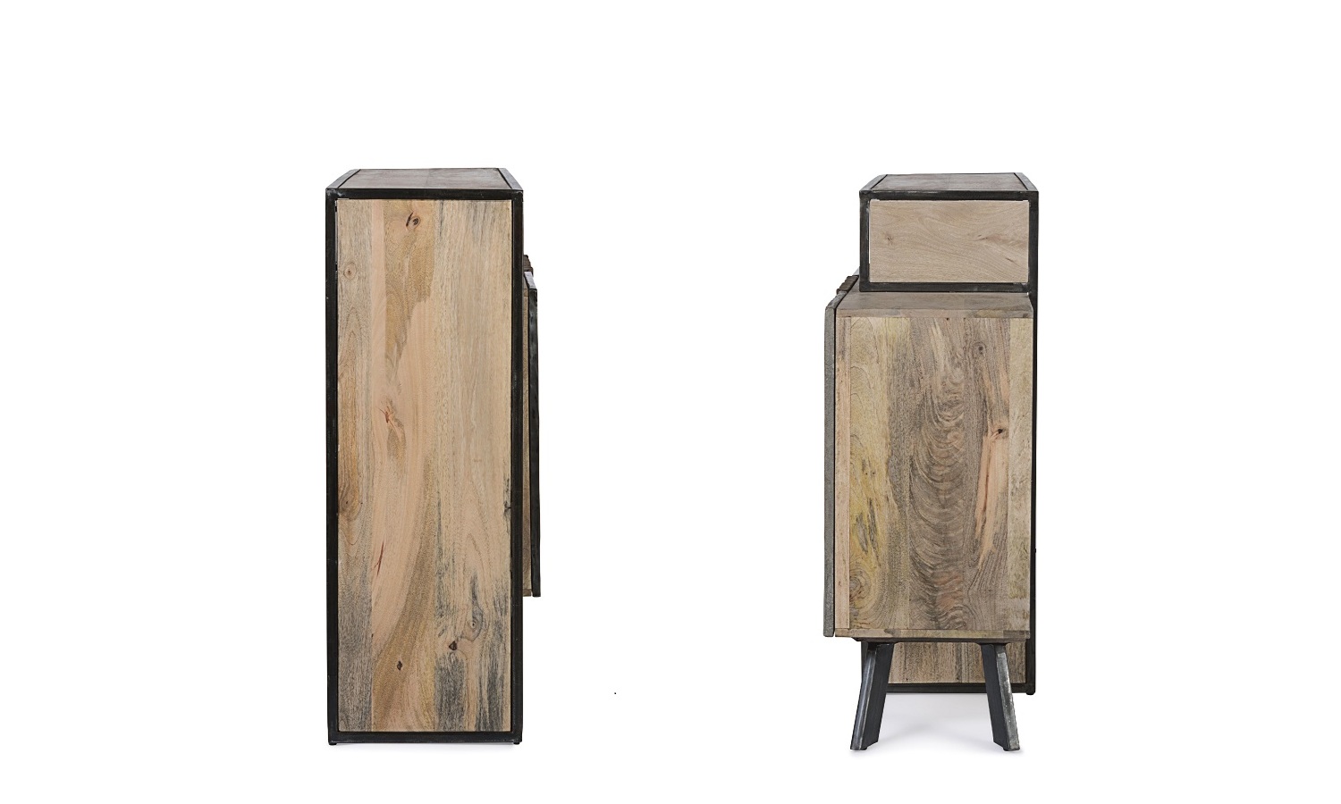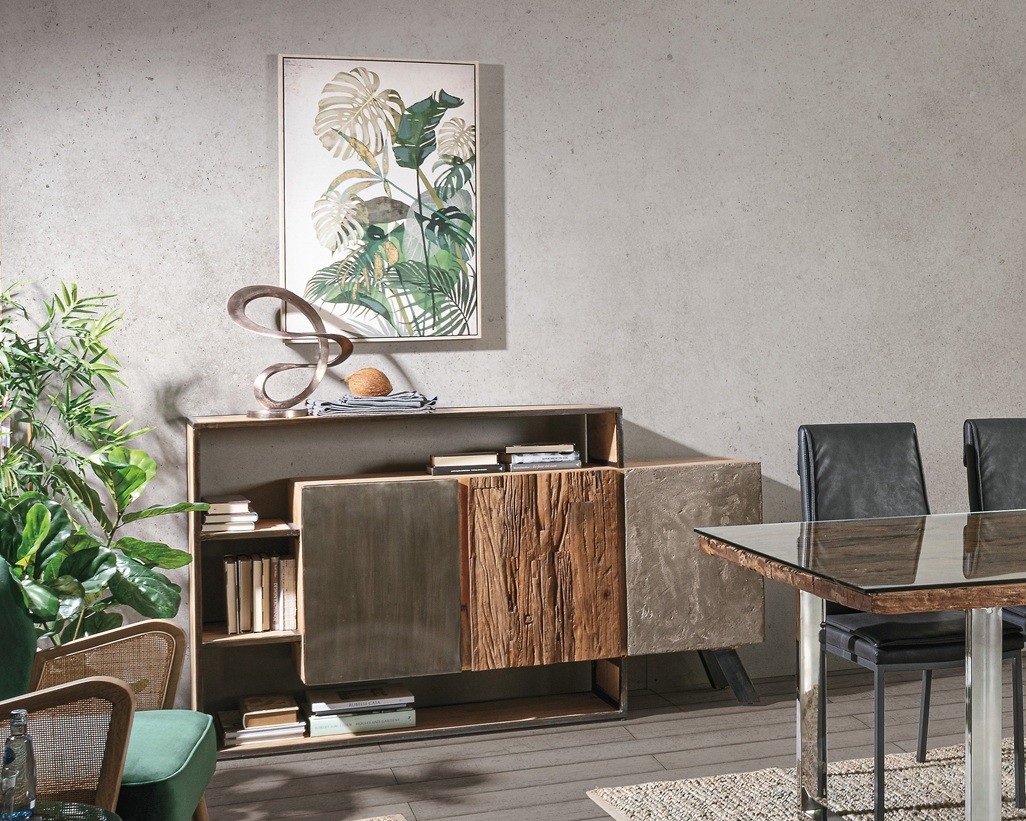 Haz que tu hogar destaque con este aparador de ALTO IMPACTO, una pieza de diseño única que fusiona madera maciza de mango, acero robusto y detalles frontales de madera reciclada, lámina de acero y fibra de cemento.