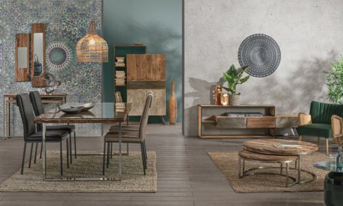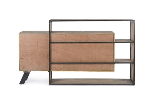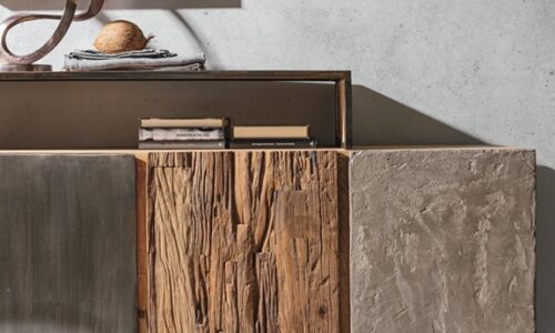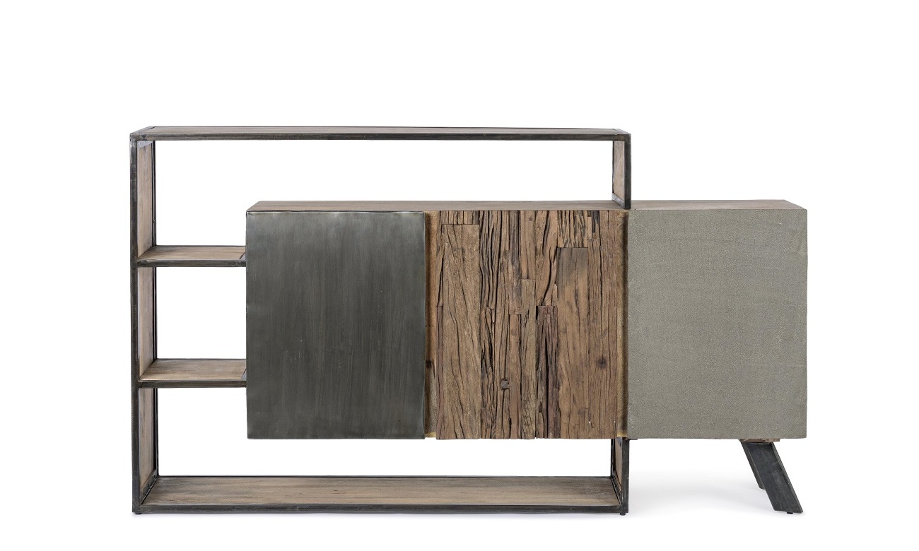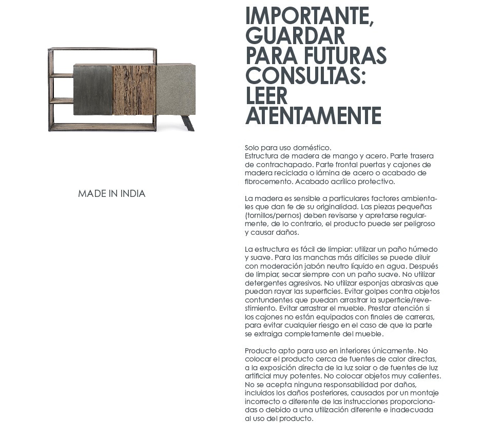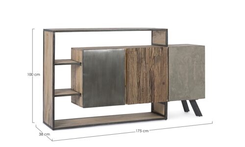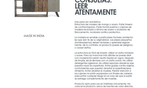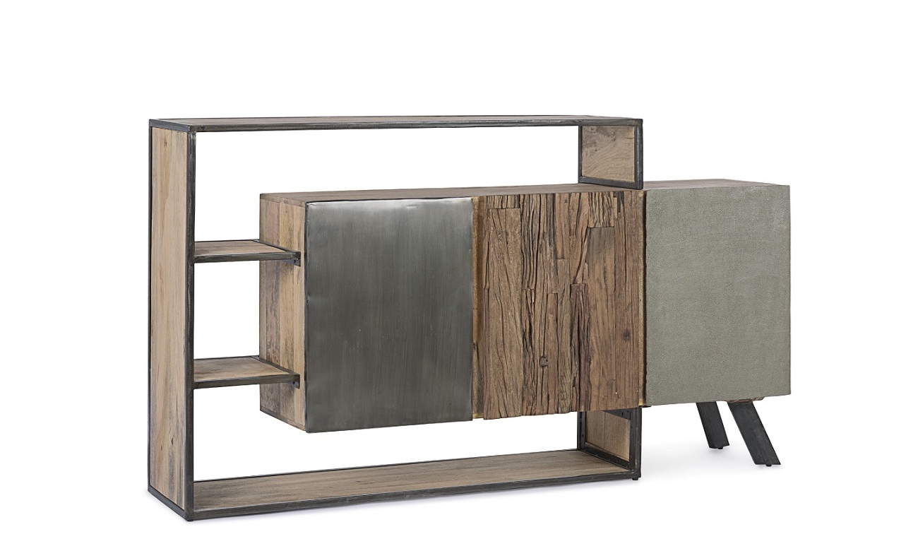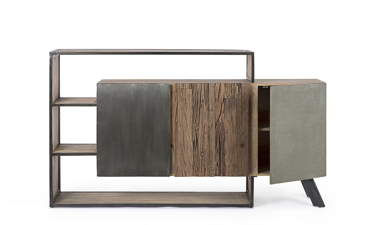 Haz que tu hogar destaque con este aparador de ALTO IMPACTO, una pieza de diseño única que fusiona madera maciza de mango, acero robusto y detalles frontales de madera reciclada, lámina de acero y fibra de cemento.
