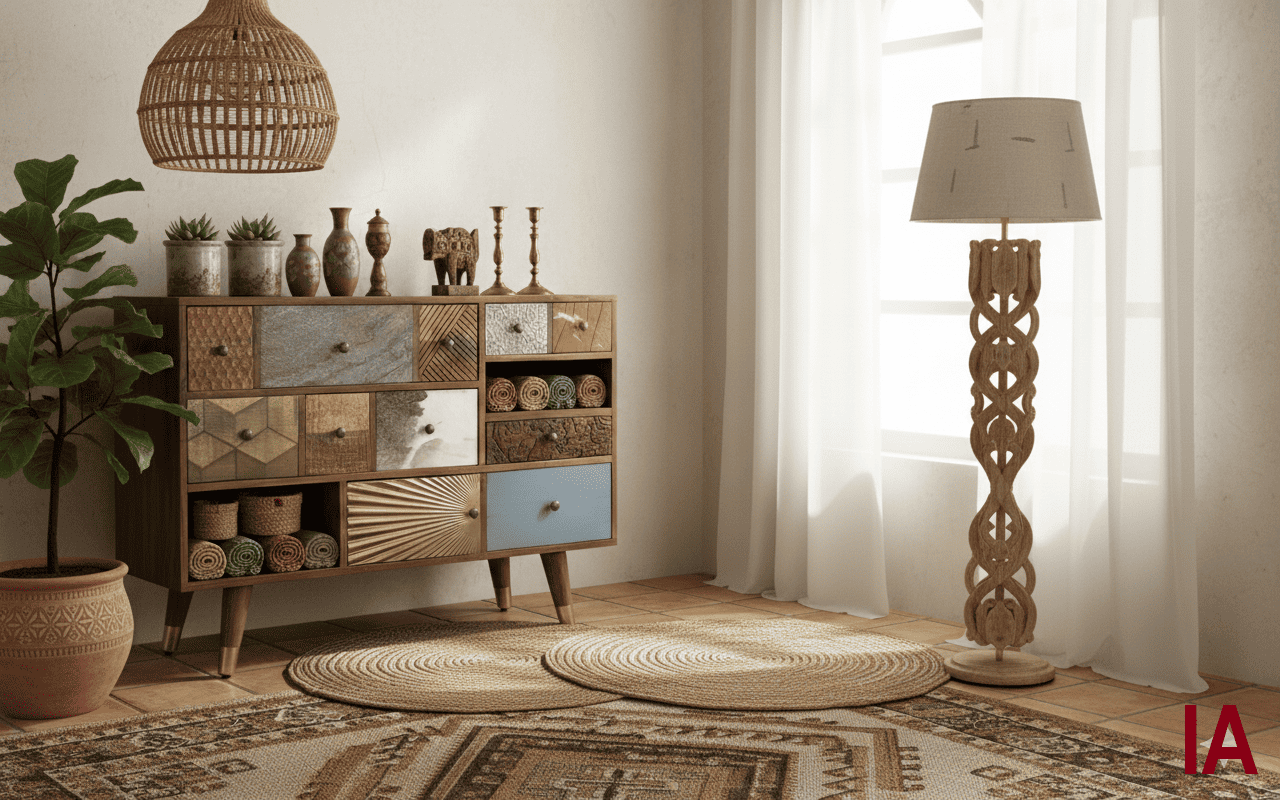 Mueble fabricado en madera maciza de mango, con un diseño étnico y urbano a la vez. Su característica principal está en los acabados de sus fronteras de puertas y cajones. con diferentes combinaciones de materiales (piel de vacuno, hermosos tallados, madera vieja, metales repujados). Configurado con 5 cajones y 1 puerta, el contraste entre la calidez natural de la madera y esta combinación de materiales crea un efecto visual armonioso y decorativo, consiguiendo unos diseños ideales para espacios que buscan un toque artesanal y sofisticado, encajando perfectamente en ambientes rústicos, étnicos o contemporáneos.