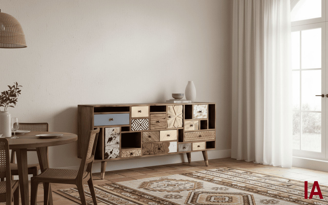 Mueble fabricado en madera maciza de mango, con un diseño étnico y urbano a la vez. Su característica principal está en los acabados de sus fronteras de puertas y cajones. con diferentes combinaciones de materiales (piel de vacuno, hermosos tallados, madera vieja, metales repujados). Configurado con 11 cajones y 2 puertas, el contraste entre la calidez natural de la madera y esta combinación de materiales crea un efecto visual armonioso y decorativo, consiguiendo unos diseños ideales para espacios que buscan un toque artesanal y sofisticado, encajando perfectamente en ambientes rústicos, étnicos o contemporáneos.