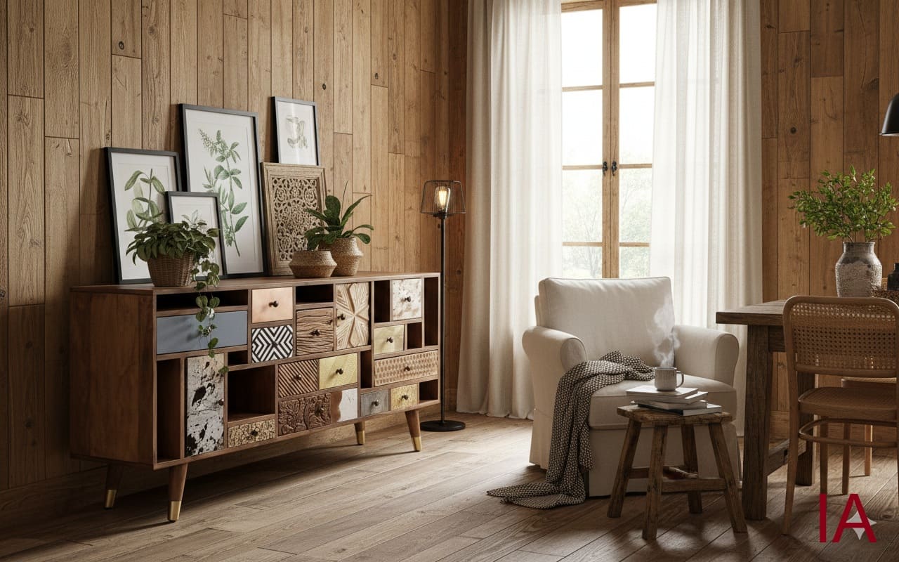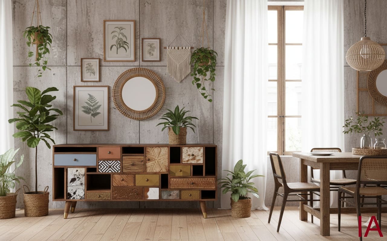 ¿Cansado de los muebles aburridos, planos y fabricados en serie? 🤯 Es hora de dar un golpe de AUTORIDAD DECORATIVA, SOLIDEZ ARTESANAL Y SOFISTICACIÓN ABSOLUTA. El APARADOR MIKS no es solo un mueble de almacenamiento; es una PIEZA DE COLECCIONISTA que fusiona la calidez de la madera de mango con un mosaico salvaje de texturas y materiales nobles. Si buscas una pieza agresiva en personalidad pero impecable en elegancia, ¡TIENES QUE ADQUIRIR ESTA JOYA AHORA MISMO!