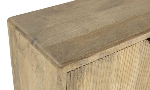Su construcción en madera maciza de mango con las puertas con un moldurado semicircular, no solo le confiere durabilidad, sino que también agrega una rica profundidad de color y textura. El diseño limpio y minimalista permite que la madera de mango sea la protagonista, destacando su grano único y su belleza natural. Las líneas simples y la atención meticulosa a los detalles crean un aspecto elegante y atemporal que encaja tanto en entornos modernos como en ambientes más tradicionales.