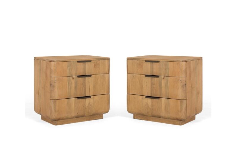 Mesita de madera de mango en color natural, con diseño minimalista y esquinas redondeadas que resaltan su estilo moderno y cálido. Está equipada con tres cajones amplios, cada uno con guías metálicas para un deslizamiento suave y funcional. Los tiradores metálicos complementan el diseño, aportando un contraste sutil y elegante al acabado natural de la madera.