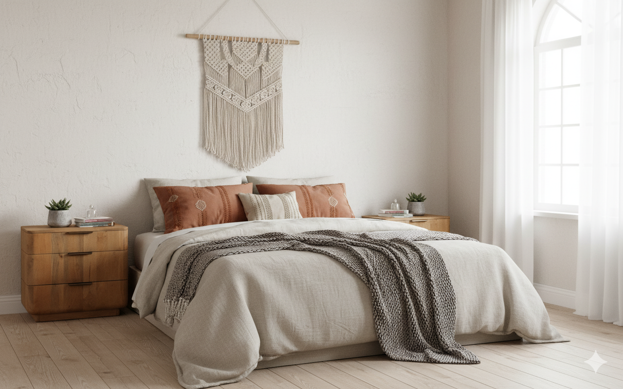 Mesita de madera de mango en color natural, con diseño minimalista y esquinas redondeadas que resaltan su estilo moderno y cálido. Está equipada con tres cajones amplios, cada uno con guías metálicas para un deslizamiento suave y funcional. Los tiradores metálicos complementan el diseño, aportando un contraste sutil y elegante al acabado natural de la madera.